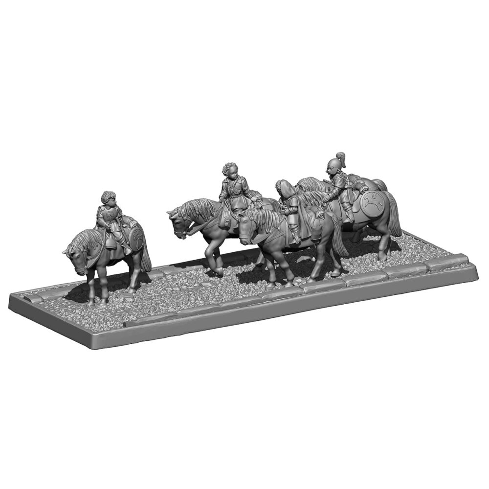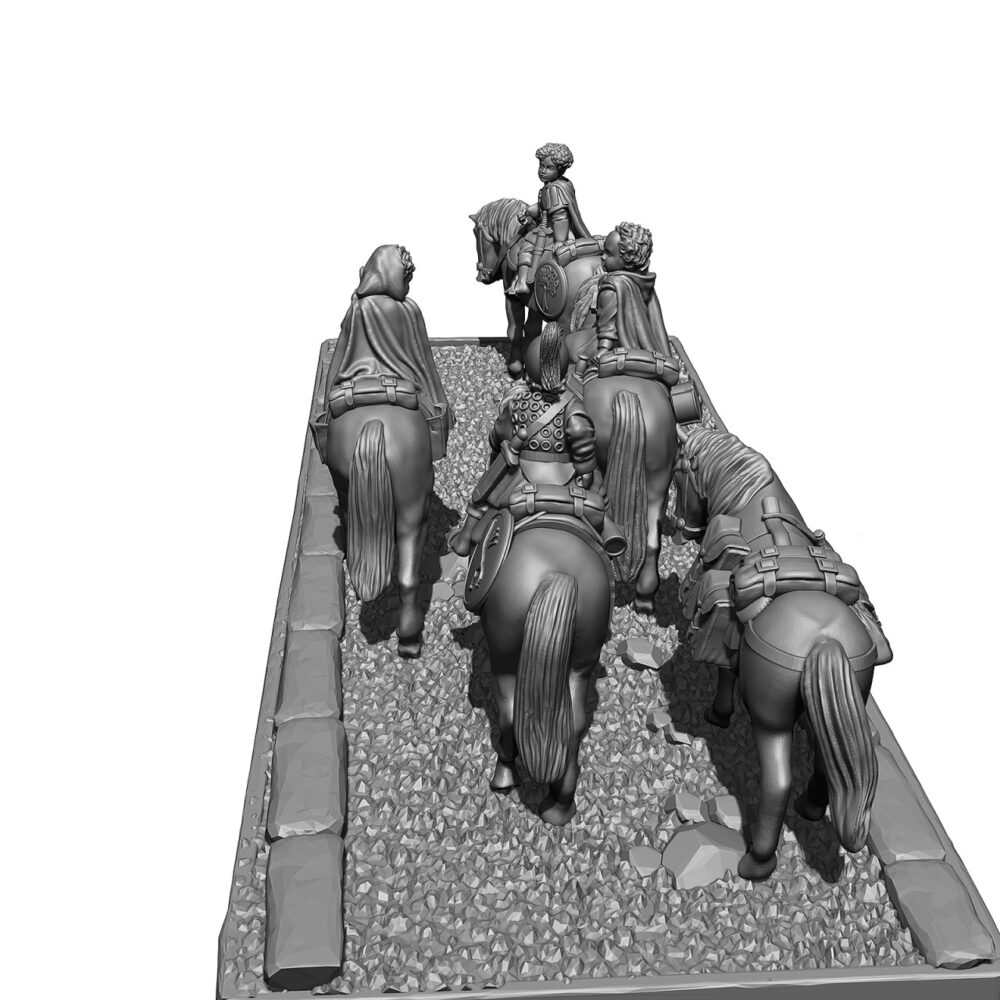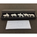 This is the eighteenth fully resin release, undercoated with matt grey primer. The v.A comes in six pieces, consisting of a large base, and four Hobbits on ponies and Bill the pony (no individual bases) They have an ‚f‘ marking on the large base. The v. B comes with 10 pieces, the four Hobbits on ponies, Bill the pony and the five small bases marked A to E. All bases have the manufacturer’s name ‚Mithril‘ on it, the MX code and the name of the sculptor and date of creation. Large base is measured at 127mm in length and 52mm in width.