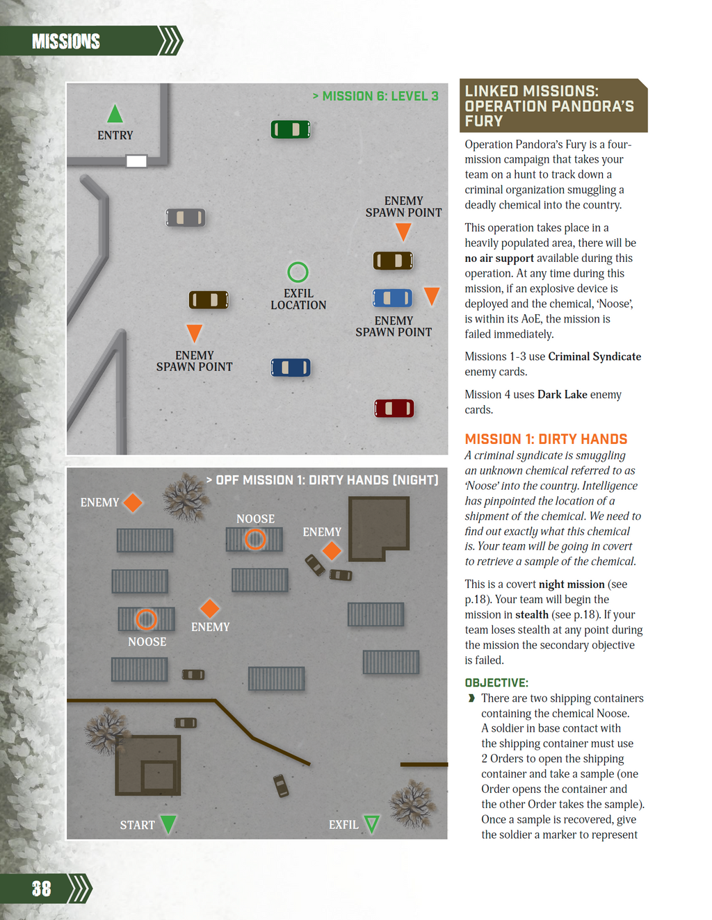 Select your fire team, enter the combat zone, and target your mission objectives. Be prepared for a multitude of situations and increasing tactical depth with each game. Play with ready-to-go soldier cards, or tailor the gear in each of your soldiers’ loadouts. You can even build your soldiers from scratch with optional advanced rules.