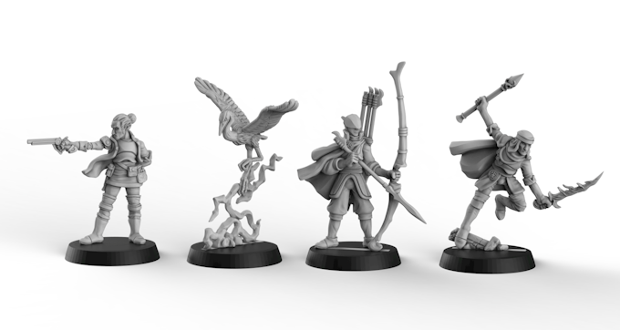 - 4 character miniatures. Minis cast in white metal and supplied unassembled and unpainted with 25mm round plastic bases.