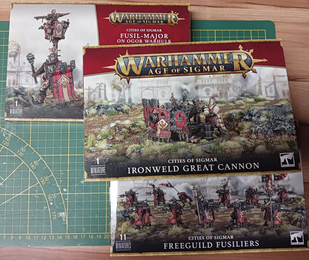 Alle drei Boxen, die Freigilden-Füsiliere, der Füsiliermajor auf Ogor-Kriegshüne und die Eisenschmiede-Großkanone, glänzen, wie bei Games Workshop üblich, bei Passgenauigkeit und Detailschärfe.