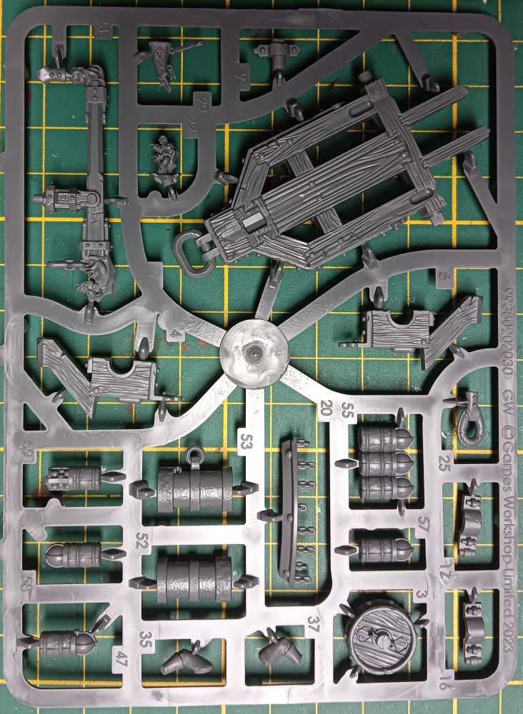Den Abschluss macht die Eisenschmiede-Großkanone. Neben ebenfalls passender Base und einem Transfer Sheet sind in ihrer Box eineinhalb Gussrahmen enthalten. Auf diesen sind neben der Kanone zwei Crew enthalten. Beide Crewmitglieder können auf zwei Arten gebaut werden. Ebenfalls sind einige Zusatzteile enthalten, die als Basegestaltung genutzt werden können.