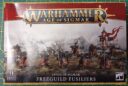 Die Freigilden-Füsiliere sind das Fernkampf-Gegenstück zu den Freigilden-Stahlhelmen. In der Box sind über drei Gussrahmen 11 Miniaturen enthalten. 10 davon sind die Füsiliere selbst und eine ist der Schwarzpulverknappe. Dieser ist kein kämpfendes Modell der Einheit, sondern nur ein Marker. Bei den Füsilieren gibt es die Optionen einen Champion mit besserer Gewehrkanone oder Pistolenpaar zu bauen und einen Füsilier mit einer Standarte auszustatten, die an seine Pavese geklebt wird. Neben den Miniaturen sind passende Rundbases für alle 11 Minis und ein Cities of Sigmar Transfer Sheet enthalten.