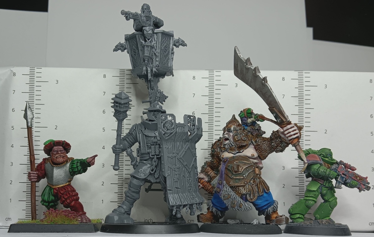 Von links nach rechts: Wargames Atlantic Landsknecht Oger, Games Workshop Füsiliermajor auf Ogor-Kriegshühne, Games Workshop Oger Vielfraß, Games Workshop Primaris Space Marine