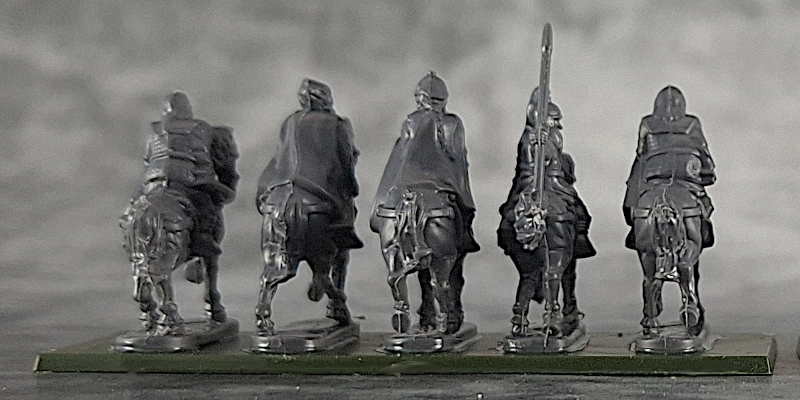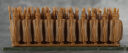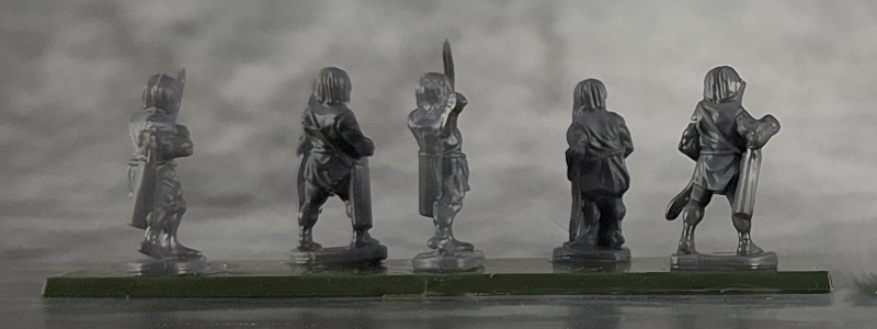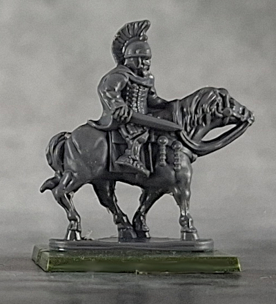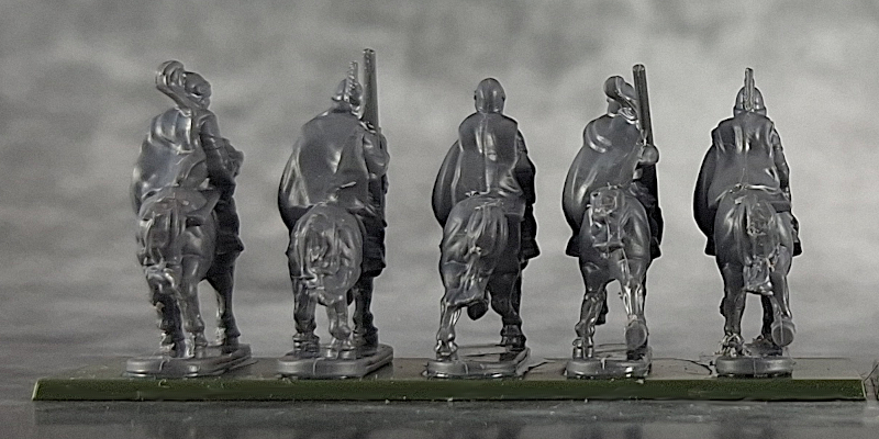Auf geht es zu den Römern. Was hier sofort auffällt: es gibt da einige merkwürdig anmutende Streifen Infanterie, bei der lediglich die Köpfe und die Ränder ausmodelliert sind. Das ist kein Fehler der Maschine. Vielmehr besten die Einheiten der Römer aus stattlichen 30 statt 20 Mann pro Base. Daher gibt es für jede Einheit Front, Mitte und Rücken die zusammengeklebt werden müssen bevor sie auf ihr Base gesetzt werden. Dadurch ergibt sich ein solider Block der sich durchaus sehen lassen kann. Was die Kavallerie angeht sind nur jeweils zwei von den fünf für ein volles Base notwenigen Pferde enthalten. Eine Box Römer enthält viermal diesen Gussrahmen, so dass am Ende jeweils nur ein volles Base pro Box baubar ist.