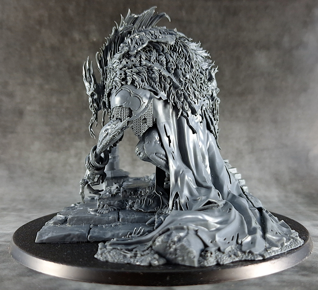 Der Zusammenbau dauert natürlich deutlich länger, es sind aber eben auch deutlich mehr Teile. Ab und an muss man ein wenig die Teile hin und her drehen um die exakte Position zu finden, dafür sitzen sie super wenn man die korrekte Position gefunden hat. Während man das Modell zusammenbaut findet eine Wandlung von großem, aber schlanken Modell zu einem ordentlich voluminösen Brocken statt. Zunächst wird der Mantel hinzugefügt, was aber am Gesamtbild noch nicht wahnsinnig viel ändert. Erst das Hinzufügen des Pelzes verleiht dem Modell seine Masse. Das Dioramabase und auch Ushoran selbst ist mit vielen kleinen Details ausgestattet. Sei es nun die Amtskette und die Armreifen oder die ganzen im Fell verstecken Köpfe oder die mit Knochen übersäten Ruinen. Er füllt auch die 130mm Rundbase fast vollständig aus.