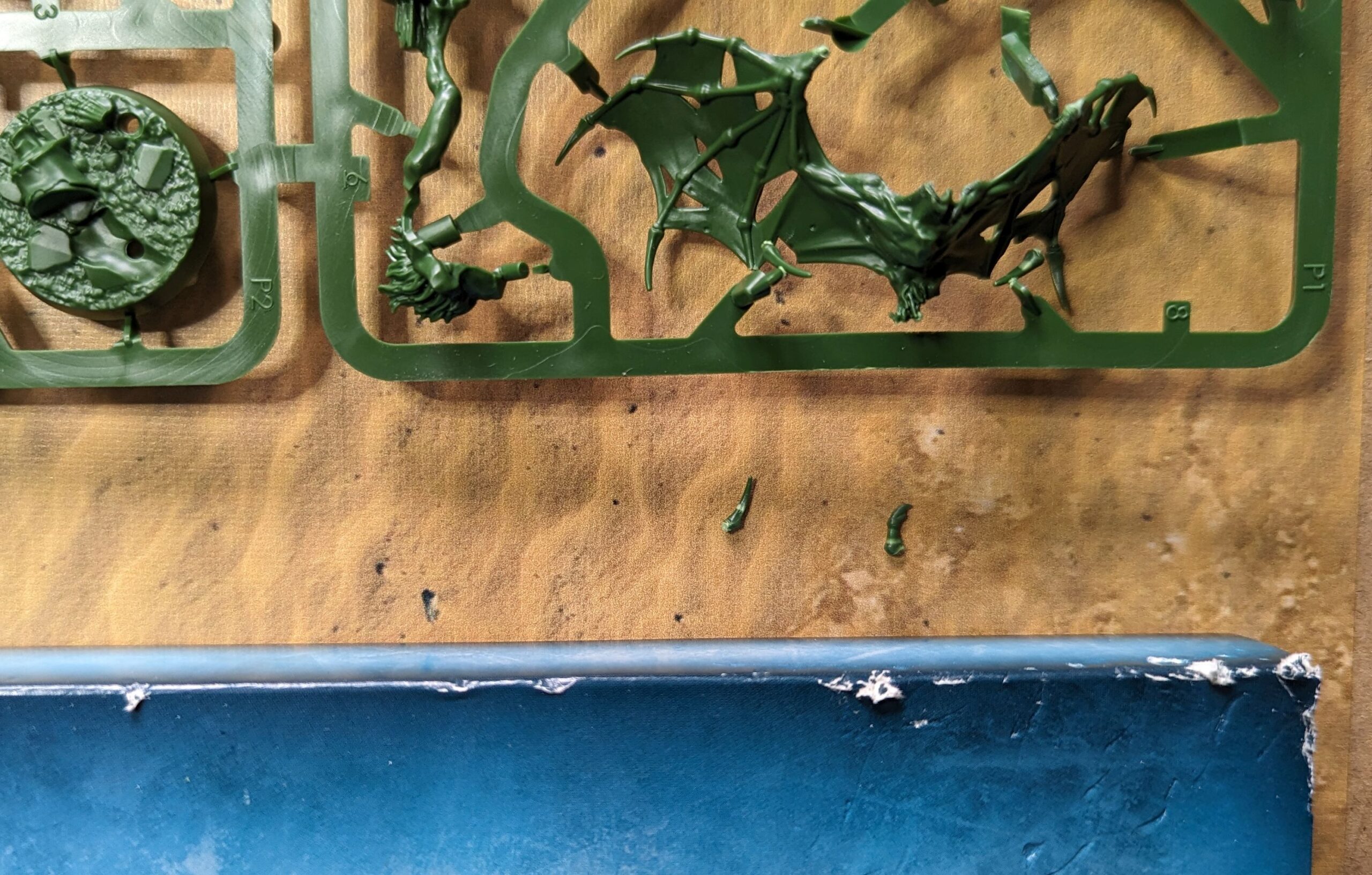 Leider kam es bei dem Anfangs erwähnten Gewicht der Papierkomponenten anscheinend zu Problemen für das ausladenste Teil im Gussrahmen. Dabei sind einige der Stacheln an den Flügeln der Fledermauskreatur „Der Karnskyr“ zu Bruch gegangen. Auch hat der Gegenpol, die Kartenpackung, anscheinend dazu beigetragen und dementsprechende Schäden davongetragen.
