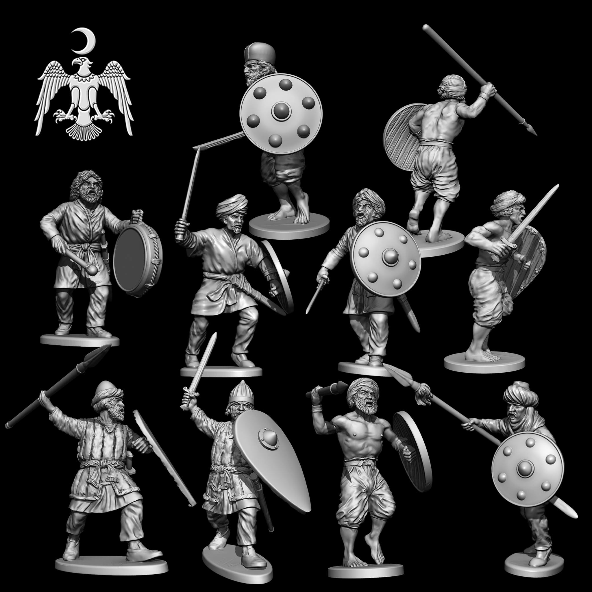 Here we have some more updated renders of the Islamic infantry set we have been working on.These are primarily going to be infantry for use as Arab, Syrian and Abbasid and Fatamid Egyptians from the 10th to 13th centuries but can easily be used in earlier Arab conquest and early Caliphates armies as well as being used in Spain.We have just finished the spearmen element of the set which also has other hand weapon options such as axes and swords. There are some command components such as standard bearer arms, trumpets and drums as Islamic troops liked a lot of noise to go into battle, and used drums to communicate orders.Some archers are being worked on and they should be finished sculpting in the next couple of weeks. There will be spare bow arms so you will easily be able to use spearmen as archers and archers as spearmen so plenty of variety included.There are a lot of head options in this set including turbans, helmets, hats and bare headed, reflecting the multi ethnic nature of Islamic armies.There will be a variety of shield shapes and whole range of new Islamic shield and flag transfers coming from LBMS.This will be a great 48 figure set, full of dynamism and variation and will make great opponents for Crusader and Byzantine armies.