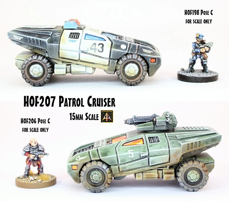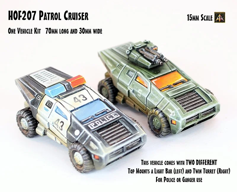 HOF207 Patrol Cruiser: One resin and metal vehicle kit in 15mm scale. Composed of the resin four wheeled vehicle and two different metal top load outs. Included are a police light bar (to make it a patrol cruiser) and a two barrel light magnetic accelerator turret (for fire support or to make it a gang land cruiser). The vehicle is 70mm long and 30mm total width.