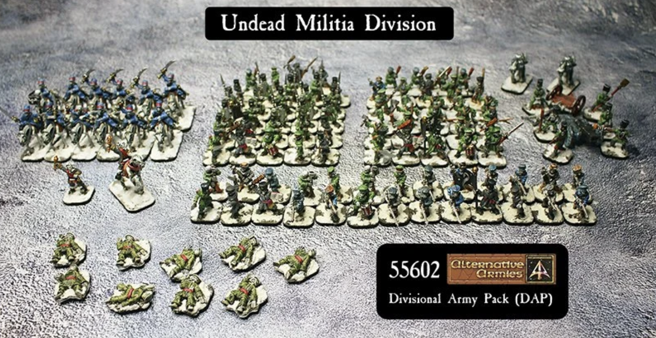 55602 Undead Militia Division: This Divisional Army Pack (DAP) contains all the needed 28mm metal and resin miniatures and bases to field an entire division for Slaughterloo (or a mighty array of sections for Flintloque) with a 15% saving built into it.
