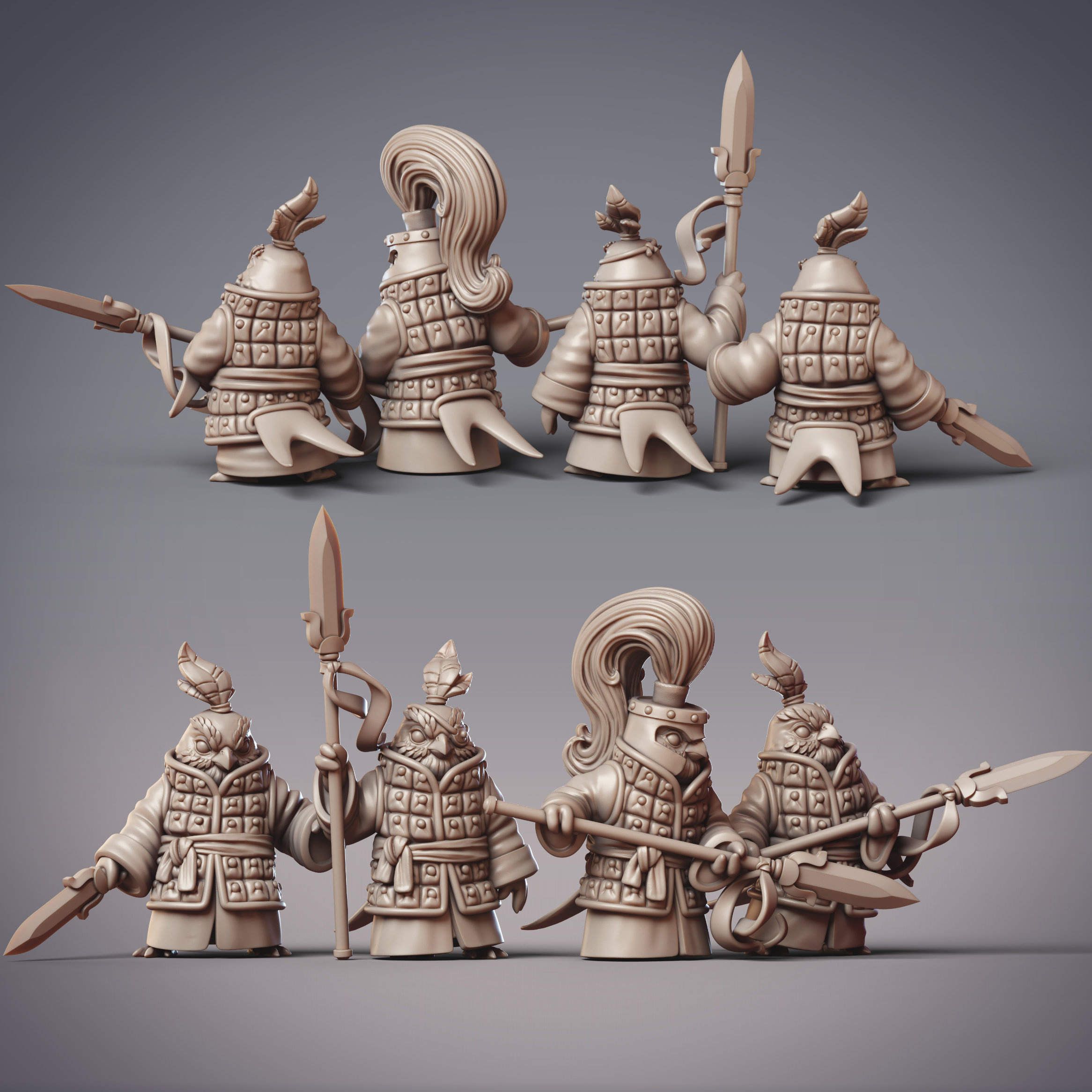This quartet of tough Yosuzume sparrow folk were hired by the YuanYang to fill out their military ranks. Though mainly spear fighters, they also carry swords for close quarters battle. Due to their small size, they don’t typically wear metal armor and prefer lighter-weight studded leather. Takei, their de facto leader, wears a fine plumed helmet to distinguish himself on the battlefield.