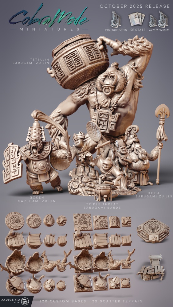 October is traditional a spooky month, and so we’re back to the area near the Demon Gate of Despair, traditionally held by the Sarugami simian folk. Living so close to the gate, most denizens become Zuijin, the elite warriors who hold back the demon forces who sometimes leak through the gate. Even if, like Tetsujin, the massive ogre-like showpiece for this month, they’re more pacifist than warrior. Or a greenhorn like Koga, for whom this is definitely his first rodeo. Not everyone can be as seasoned a veteran as Goken, whose battle skills are renowned. And sometimes the Zuijin just need some inspirational theme music from bards like Triple Threat, though their true talents lie in vicious mockery.