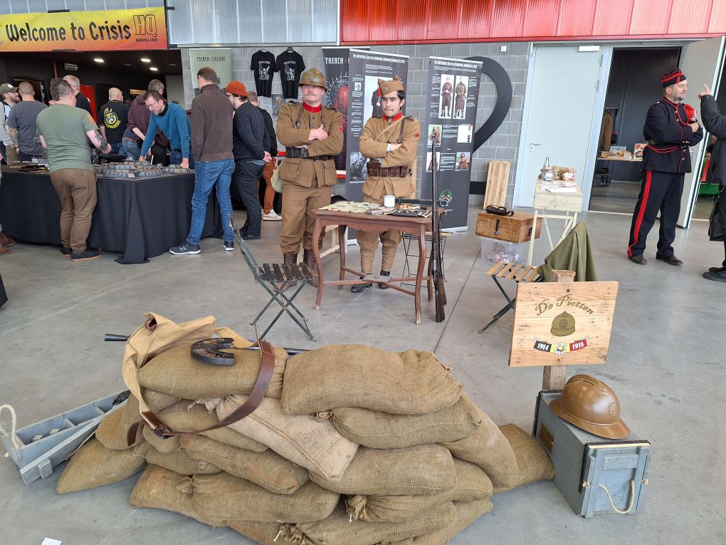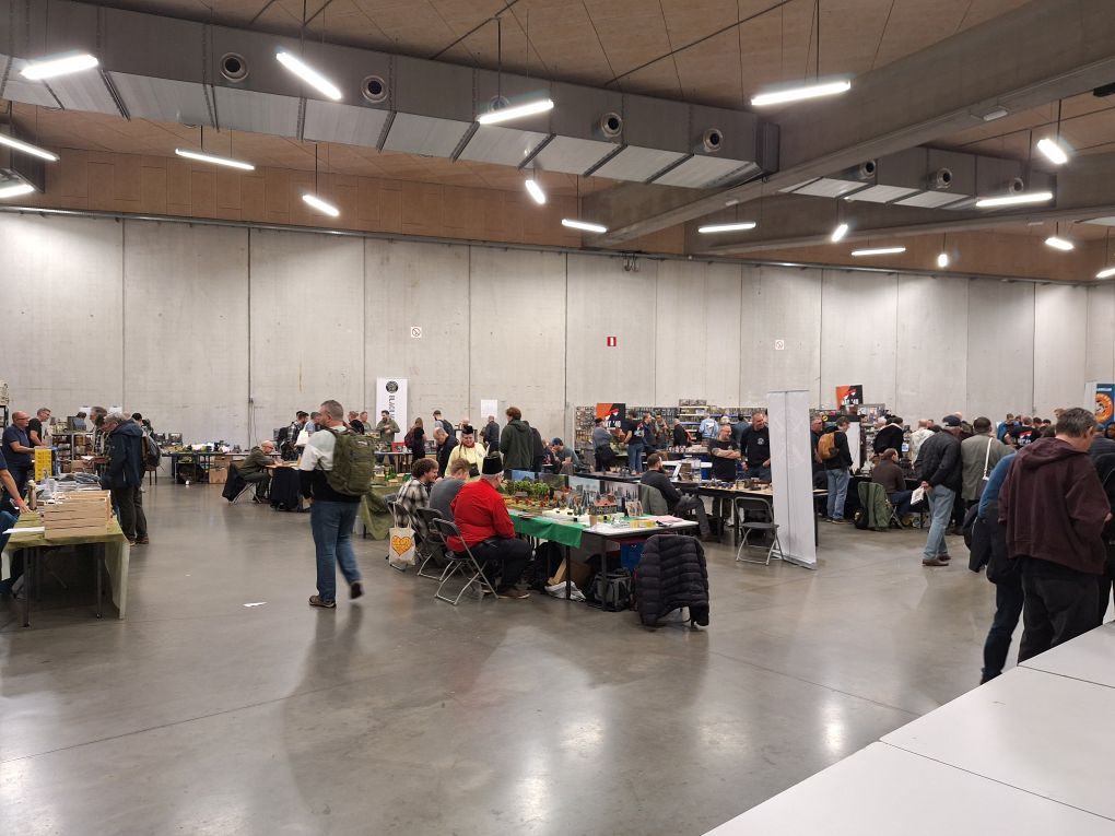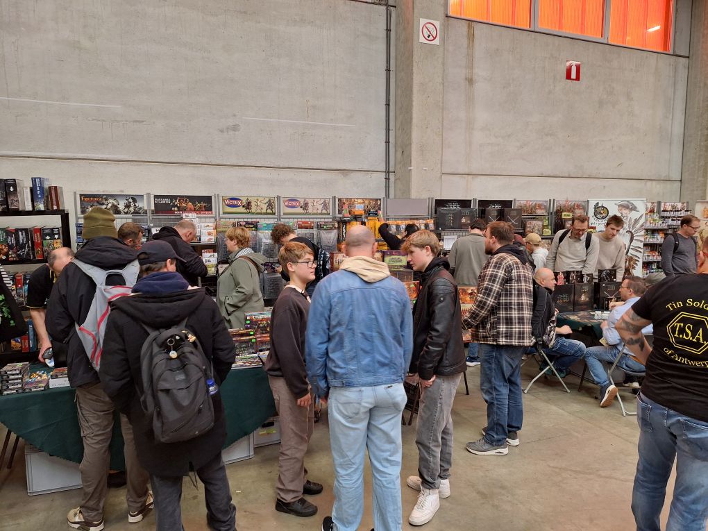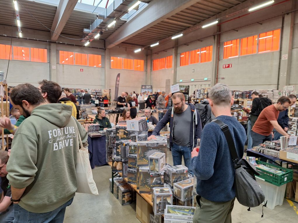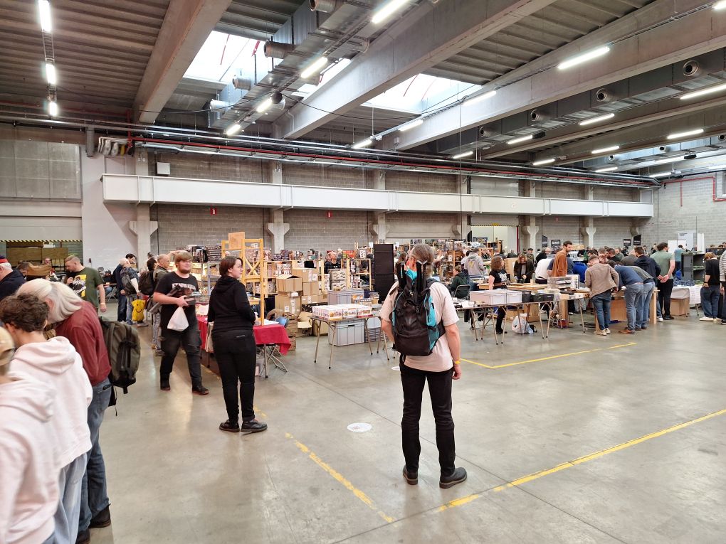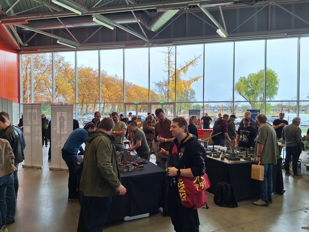 Im Wesentlichen besteht die neue Lokation der Crisis aus drei Hallen. Da wäre natürlich als allererstes die Eingangshalle welche fast vollständig von Fenstern umgeben ist. Man konnte also bereits in der Warteschlange zur Kasse hinein stieren oder die Speisekarte des Foodtrucks studieren der prominent vorm Eingang platziert war. Am frühen Nachmittag musste ich mir allerdings nicht die Zeit vertreiben, da schlicht keine Warteschlange existierte. So ging auch das Angebot des Foodtrucks an mir vorüber aber im späteren Verlauf habe ich auf jeden Fall mehr als einmal belgische Pommes mit Stoofvlees (Ja, die Belgier bieten neben Ketchup und Mayo auch mal eben ein zünftiges Biergulasch als „Dip“ an.) gesehen die mit Genuss vernichtet wurden. In den 15 Euro Eintritt waren auch drei Chips enthalten mit denen man sich in der Halle mit Getränken versorgen konnte. Das reichte entweder für einen Softdrink oder Kaffee und eine kleine Tüte Chips oder eine Flasche Bier. Erfreulich war der angenehm große Sitzbereich mit Tischen und Stühlen sowie einige Stehtische. Wer eine Pause einlegen wollte hatte hier gute Gelegenheit dazu. Händler gab si in der Vorhalle keine, dafür aber eine Gruppe Reenactor und die ersten Spieltische. Von hier aus ging es in die große Halle.