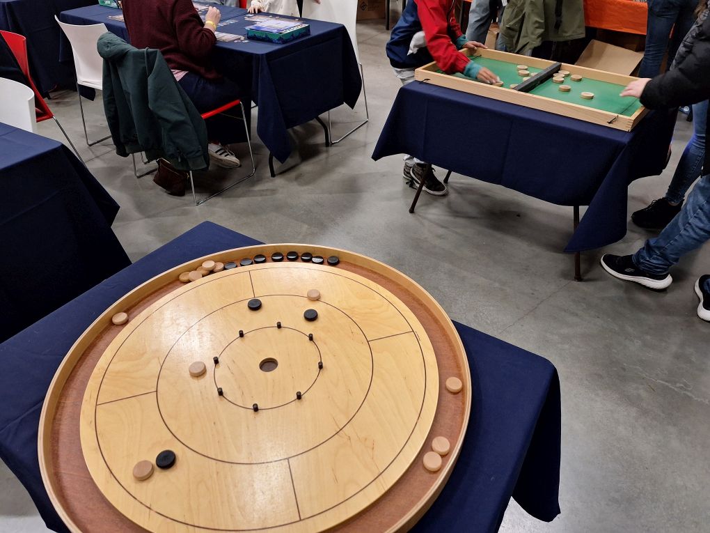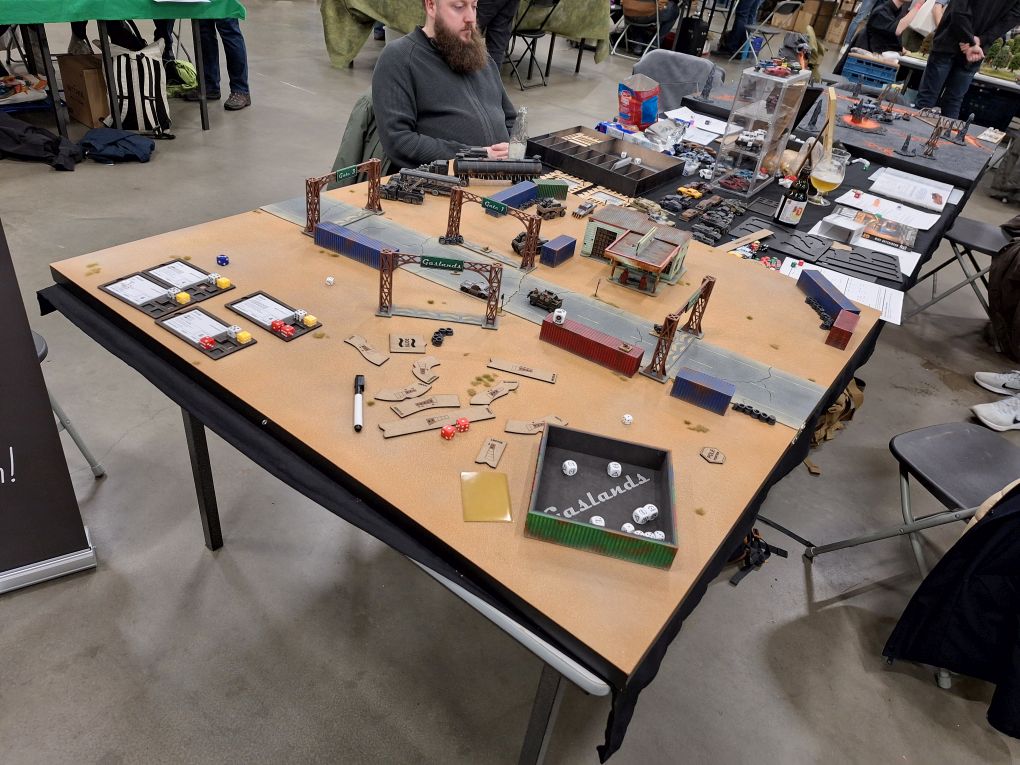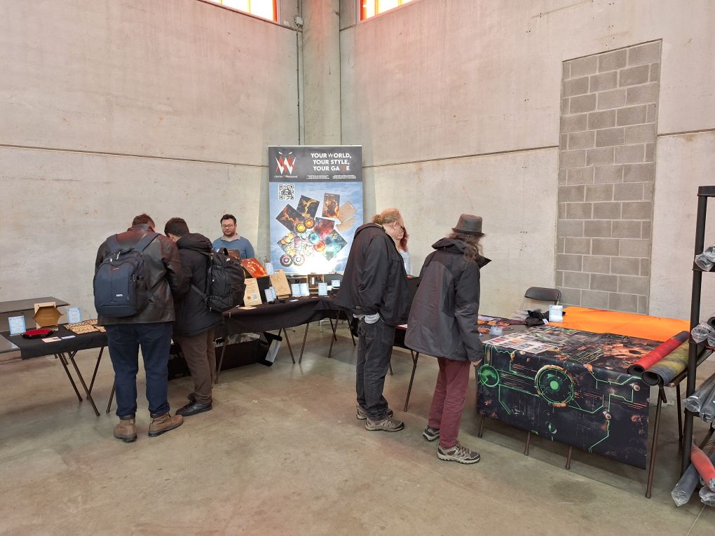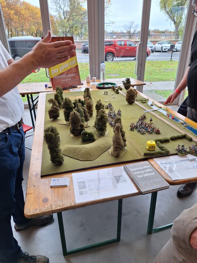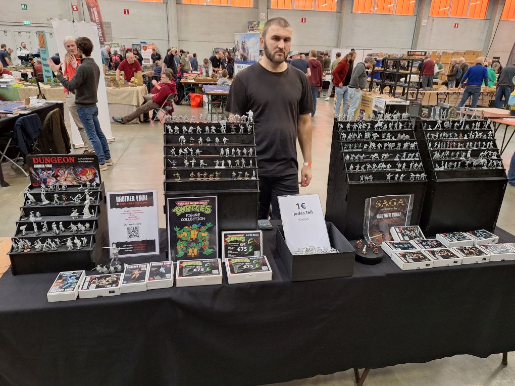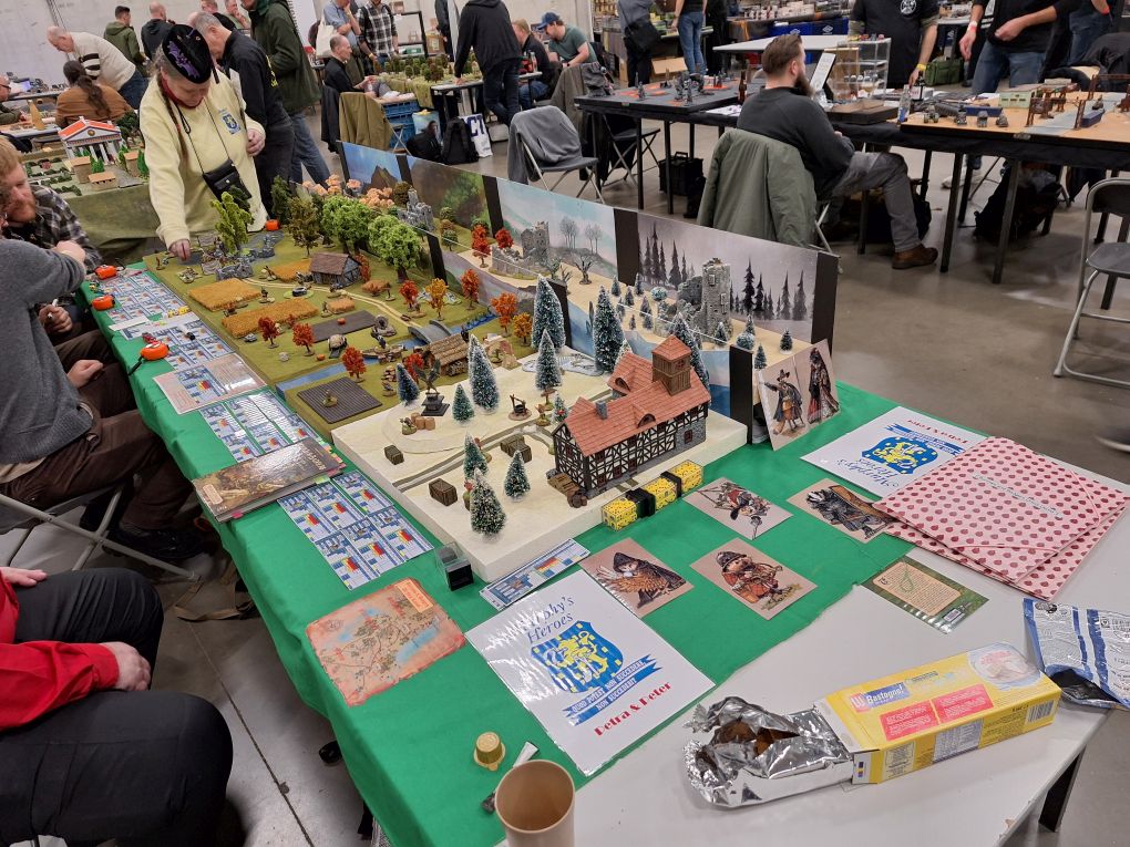 Die etwas kleinere Halle konnte man sowohl von der großen Halle als auch der Eingangshalle erreichen. Hier gab es weitere Händler und Demotische. Eine thematische Trennung fand nicht statt und so konnte man auch hier dem fröhlichen einkaufen frönen. Das wurde auch dadurch begünstigt dass man, ähnlich wie auf der Spiel, mittlerweile fast überall auch mit Karte zahlen konnte. Einen Bring&Buy gab es leider nicht. Der findet separat im Dezember statt und wurde mit kleinen Aushängen an den Wänden beworben. Was die Spieltische angeht, hier gab es quasi die volle Bandbreite. Von historisch über Fantasy bis Science-Fiction. Von eher zweckmäßig bis hin zu künstlerisch wertvoll war alles dabei. Das betrifft auch die Spielfeldgröße als solches. Hier hat sich tatsächlich gegenüber früher nicht viel verändert und das ist auch gut so. Die Crisis zeigt immer wieder aufs neue was für gewaltige Spieltische möglich sind, aber eben auch, dass man bereits mit wenigen und einfachen Mitteln ein schönes Spielerlebnis haben kann. Oder anders ausgedrückt: Welche doch recht große Bandbreite dieses Hobby abdeckt.
