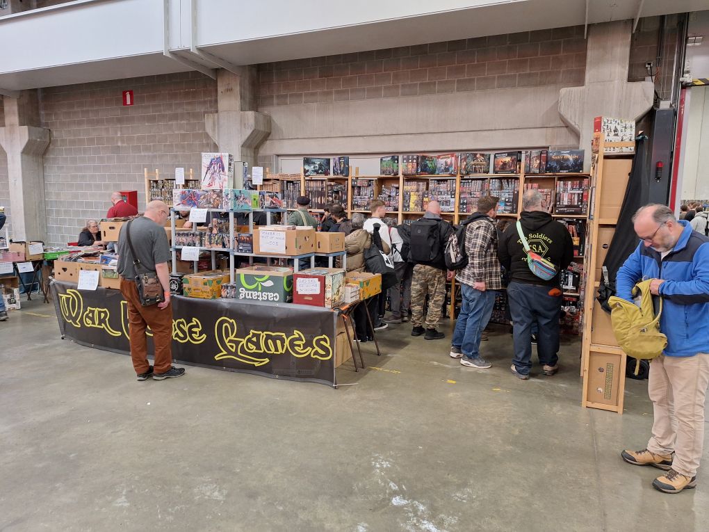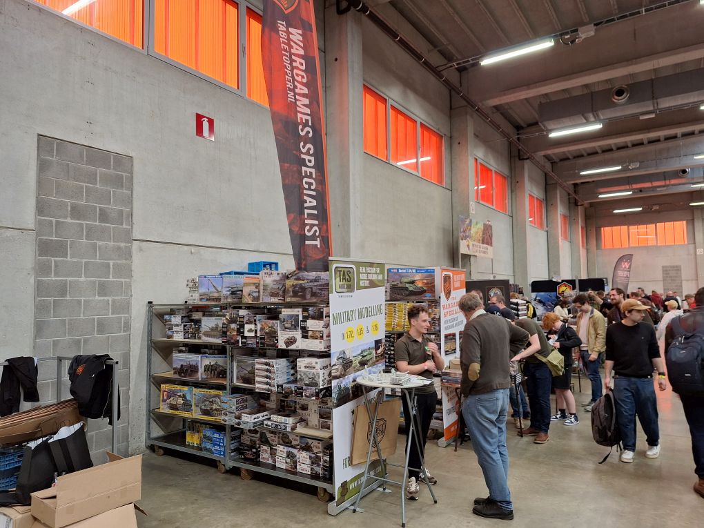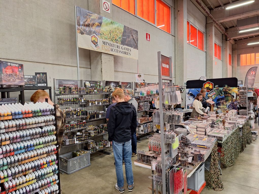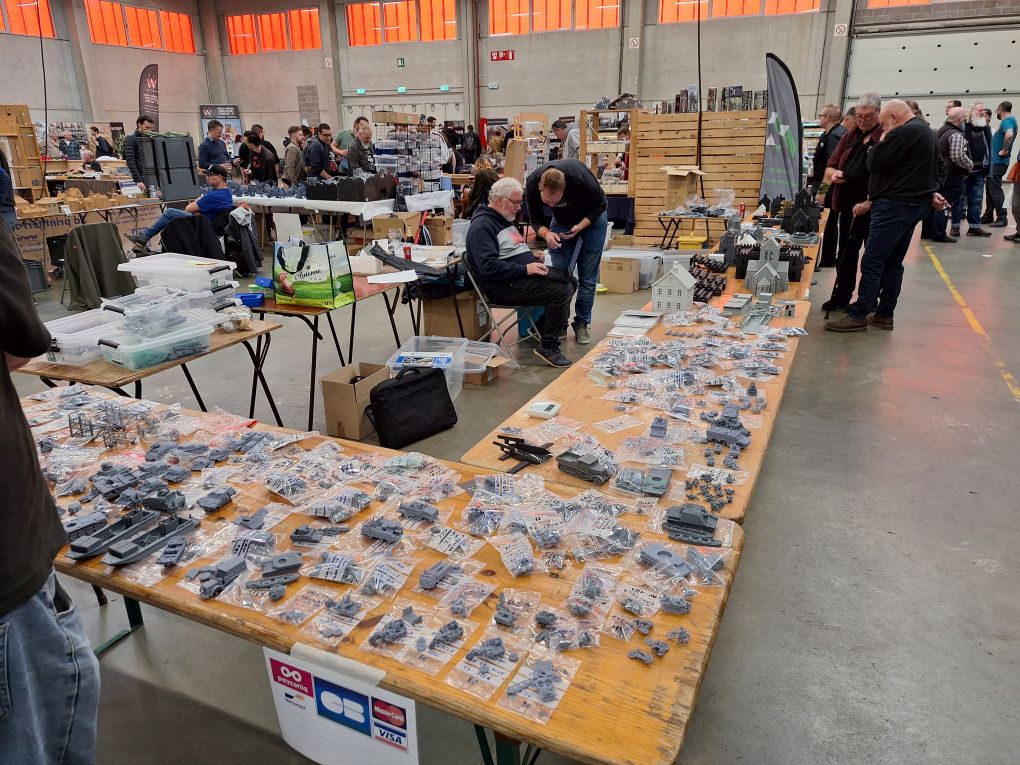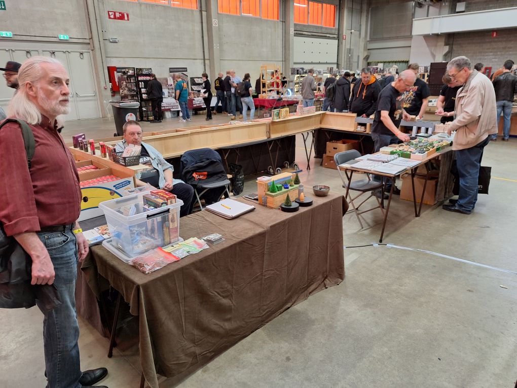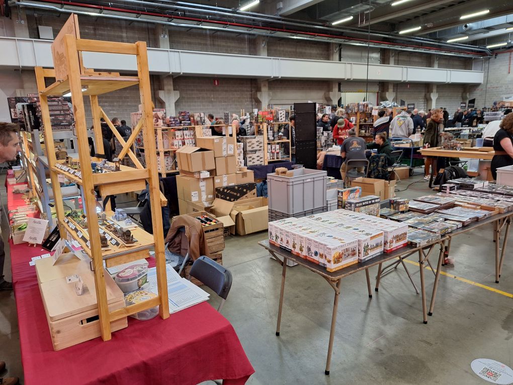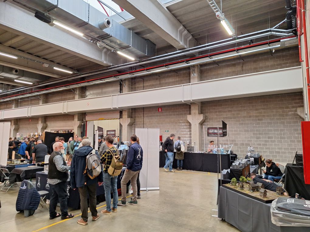 In der großen Halle fanden sich dann jede Menge Händler und weitere Spieltische. Das Angebot war reichhaltig. Neben allerlei Miniaturen gab es auch reine Geländeverkäufer und sogar einen Werkzeuganbieter. Bei den Geländehändlern konnte man den Wandel der Zeit erkennen. Früher waren hier Resinguss und Holz prominent, diesmal gab es schon deutlich mehr 3D-Drucke. Das Miniaturenangebot war reichhaltig, die Preise gut. Nicht umsonst sind einige Besucher am Ende mit vollgepackten Armen, Rucksäcken, Taschen oder manchmal sogar kleinen Handwägen aus dem Gebäude raus. Die Crisis war aber schon immer eher eine Kaufmesse. Im Vergleich zur Spiel gab es hier auch jede Menge Angebote für Fans des historischen Tabletops. An den Händlerständen mit weniger stark fokussiertem Sortiment waren vor allem (aber nicht ausschließlich) Produkte von Warlord Games, Rubicon, Victrix und Games Workshop vertreten. Natürlich fand man auch Star Wars Legion, Shatterpoint, Frostgrave und vieles mehr, aber mir kam es so vor als wären vor allem die erstgenannten Marken besonders prominent. Freebooter Miniatures mussten kurzfristig absagen, Stronghold Terrain hatten in der kleinen Halle einen Stand.