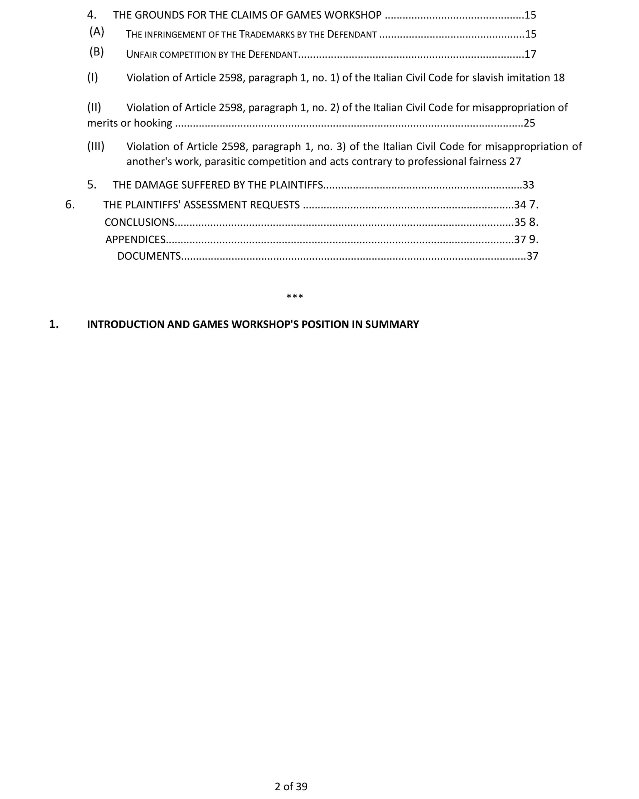 Die Einschätzung, dass Games Workshop keine klassische Copyrightklage vorgelegt haben, sondern behaupten, dass der Verkauf von Modellen, die für GW-Spiele genutzt werden können, generell verboten sein sollte („claiming in substance that creating models compatible with GW’s games is illegal per se“), ist zumindest zweifelhaft. Bereits der erste Klagepunkt bezieht sich direkt auf Verstöße gegen GW-Trademarks und alle weiteren Punkte (auch der, der sich auf die „unfair competition“ bezieht), bauen darauf auf.