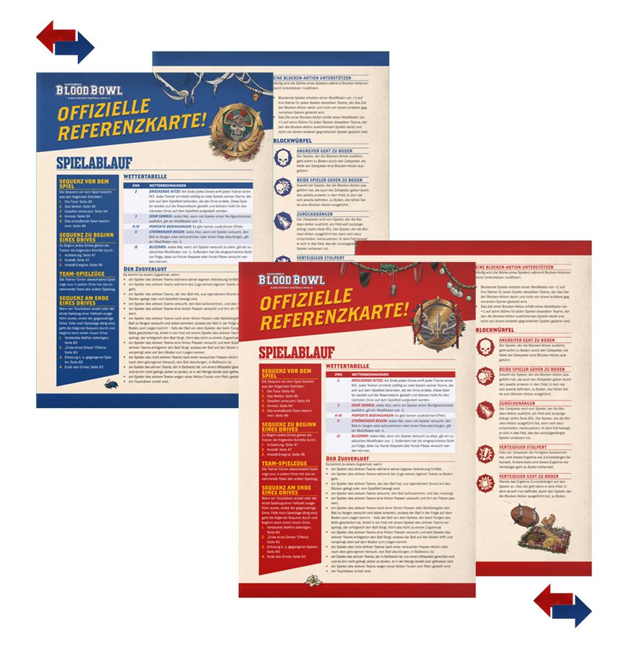 Regeln für beide Seiten des Spielfelds in deinen Blood-Bowl-Partien liegen ebenfalls bei – du findest sie aber auch im Spike! Journal: Issue 19 oder im Referenzkartenpaket des Bretonen-Teams, die jeweils separat erhältlich sind.