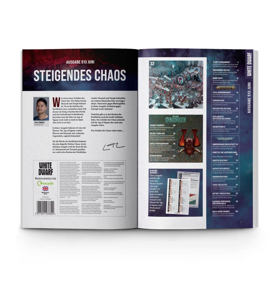 Was hat das White-Dwarf-Team diesen Monat getan? Vielleicht ein wenig gemalt?Jeder Ausgabe des White Dwarf 513 liegt außerdem ein doppelseitig bedruckter Kartonbogen bei, mit den Szenarios des Monats für Warhammer Age of Sigmar und Warhammer 40.000 sowie 8x Gaben-Karten des Khorne für Kill Team.