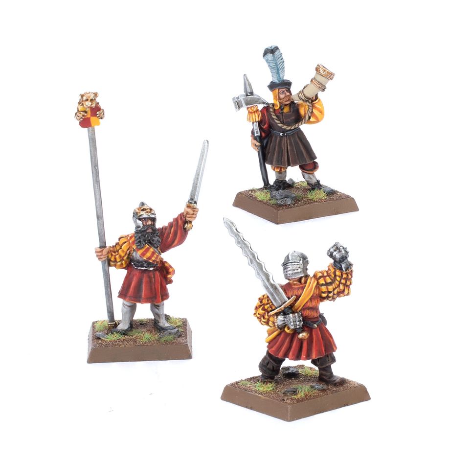 Aus diesem Metallbausatz kannst du drei Kommandoabteilungsminiaturen der Staatstruppen für deine Armeen des Imperiums der Menschen in Spielen von Warhammer: The Old World bauen. In ihm findest du einen Champion der Einheit mit einem eindrucksvollen Schwert, einen Musiker, der ins Horn stößt, und einen Standartenträger. Sie sind vorzüglich dafür geeignet, deine Truppen zu noch größeren Heldentaten zu inspirieren und deiner Sammlung noch mehr Charakter zu verleihen.