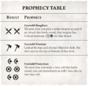 They work around their Rituals of Prophecy roll, which you make at the start of each turn, and again each time you successfully attack. Roll four dice and consult the table – if your symbols match you might fulfill one or even two prophecies, allowing you to cycle your deck, or boost your attacks or saves.