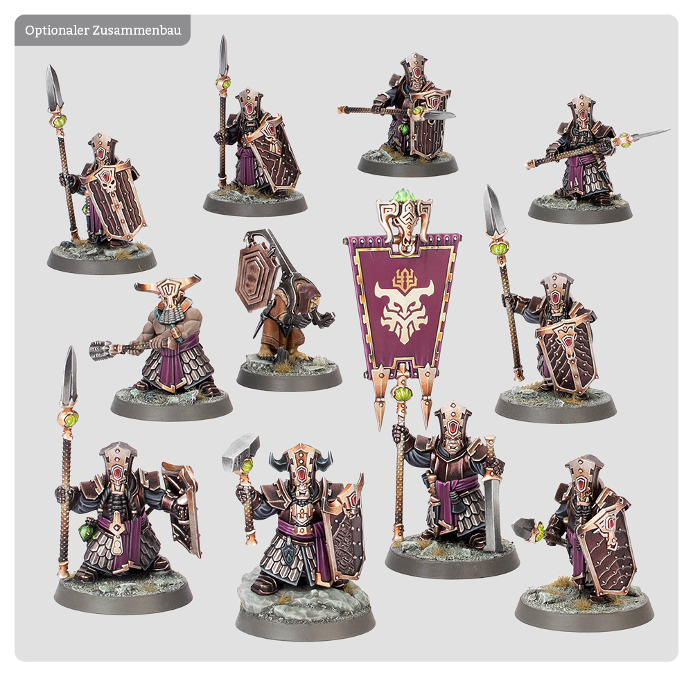 Aus diesem Bausatz kannst du drei Stierzentauren oder drei Gesalbte Wächter bauen. Letztere sind ein noch fanatischerer Schlag, der als Tempelwache ausgebildet wurde. Sie ragen auf dem Schlachtfeld hoch auf und zitieren Schriften, während die Helschmiede alles um sie herum vernichten. Sollten ihre Feinde eingreifen wollen, dann stürmen sie brutal vor. Stierzentauren können mit einer Wahl von vier verschiedenen Hörnern gebaut werden, während die Gesalbten Wächter aus drei verschiedene Masken wählen können. Zusätzlich zum Bausatz ist auch ein Abziehbilderbogen der Helschmiede des Hashut mit 450 Abziehbildern enthalten.