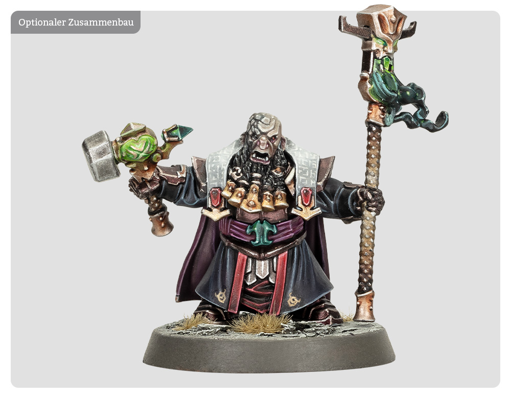 Aus diesem Bausatz kannst du auch einen Aschgrauen Ältesten bauen. Diese Priester sitzen an der Spitze der Hierarchie der Tempel, die dem Vater der Dunkelheit gewidmet sind. Sie sind mit den heiligen Schwarzen Hämmern ausgestattet, die sie im Kampf ebenso wie ihre hasserfüllten Reden schwingen. Zur gleichen Zeit behalten sie einen scharfen Blick auf ihre Soldaten, um sicherzugehen, dass sie mit dem nötigen Fanatismus kämpfen.