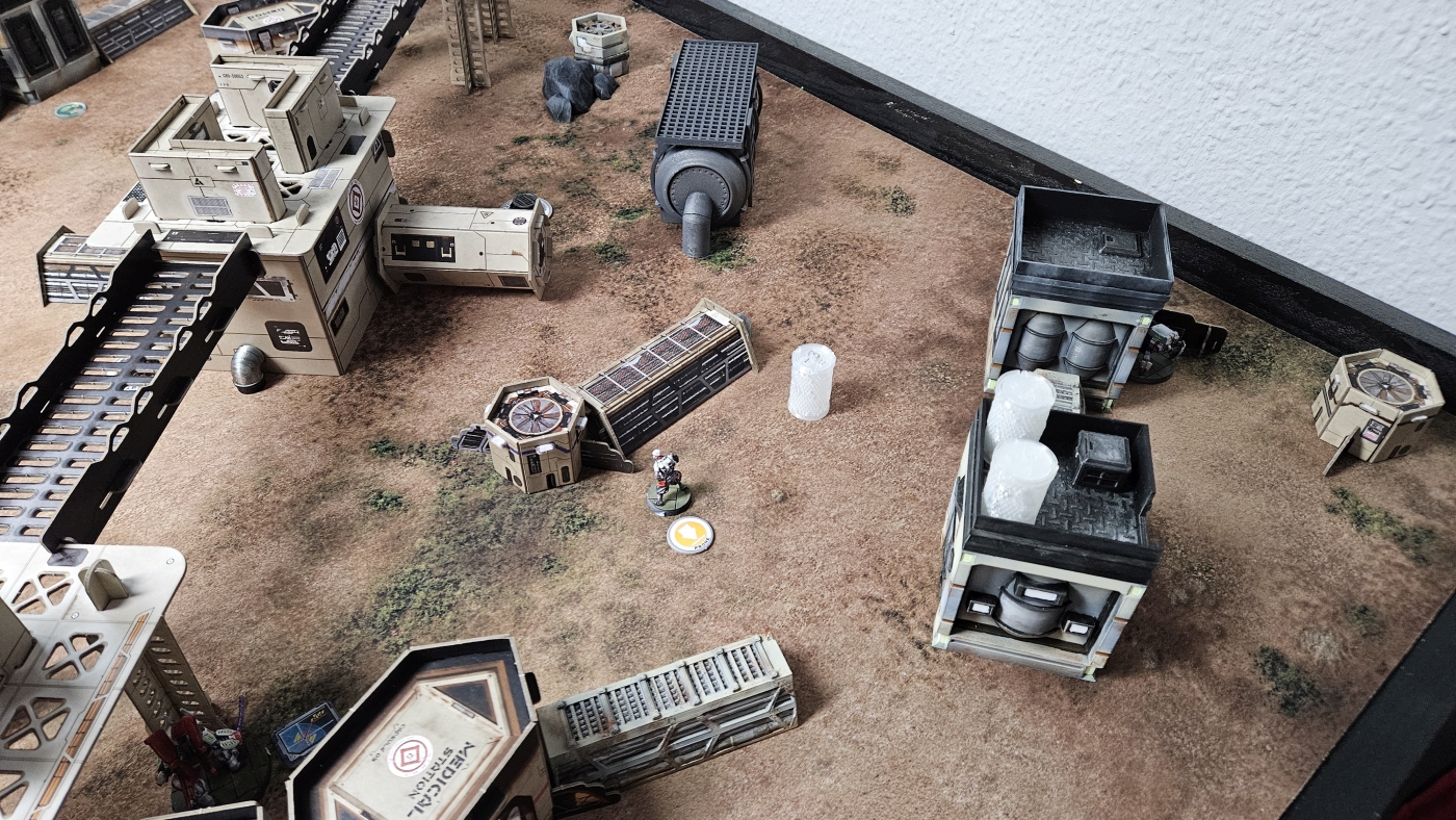 Mein zweiter Turn war etwas durchwachsen, da diverse Versuche sicher an das mittlere Missionsziel zu kommen scheiterten und einige Befehle fraß, was aber per Combined Order insgesamt dennoch effizienter ablief. Immerhin konnte mein Paramedic den vorherigen Token vom Shikami einsammeln und verstecken, bevor dieser den mittleren einsammelte und sich nur minimal zurückzog, leider.