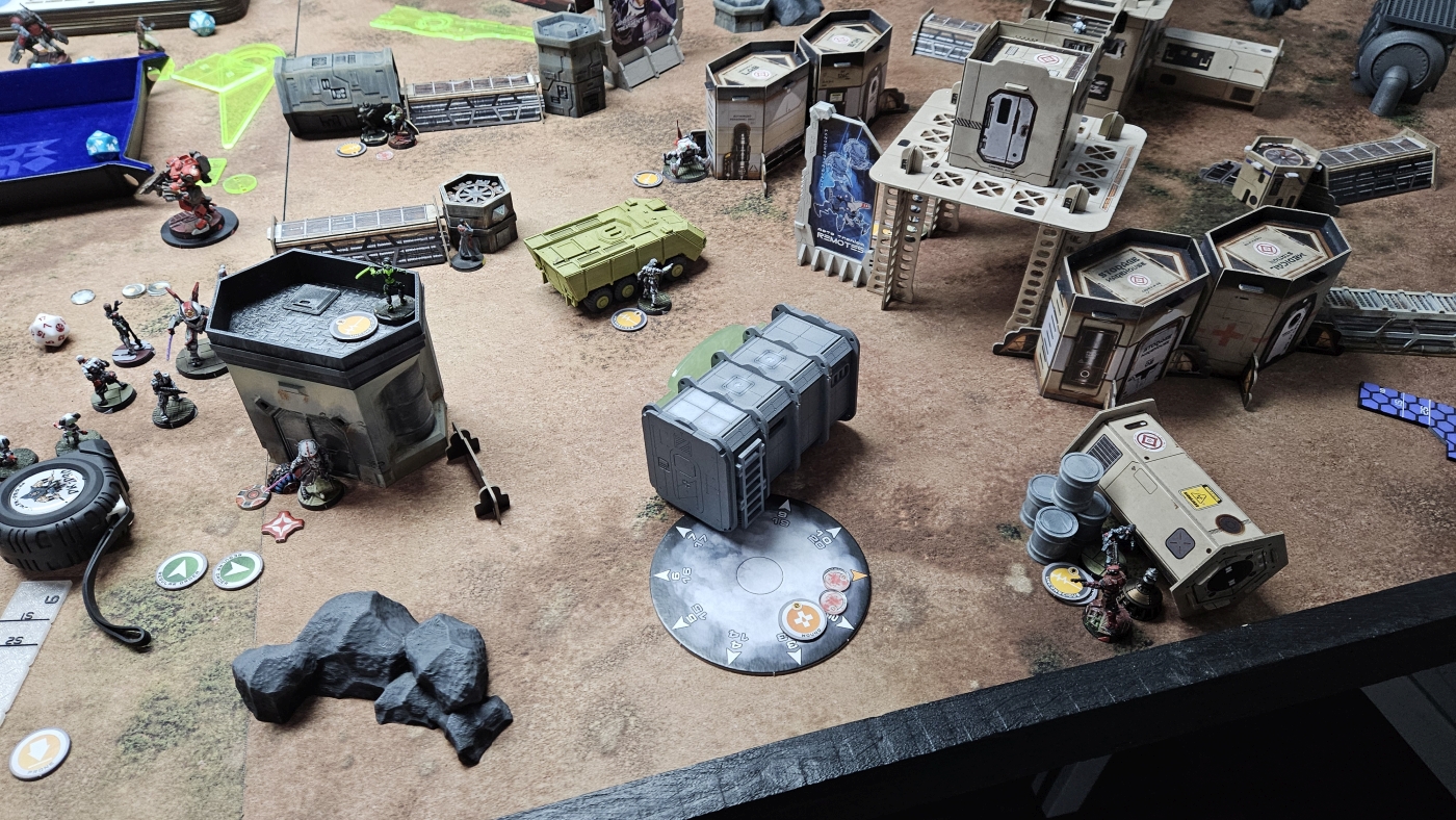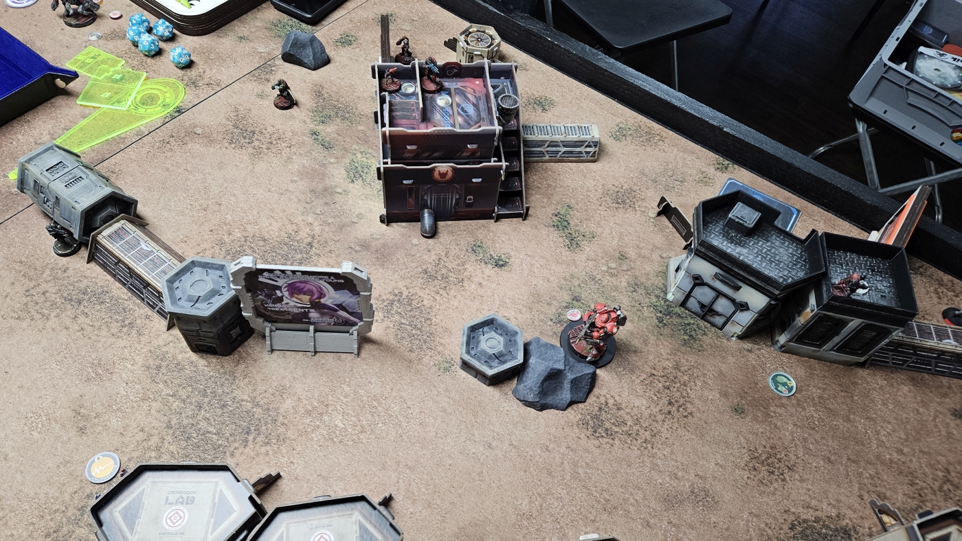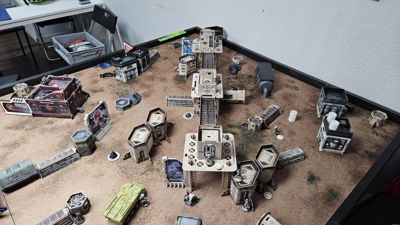Die Nomads entschieden sich als Zweiter zu agieren. Nach meinem letzten Spiel, und erstem auf 300p, hatte sich das Core Fireteam mit Keisotsus, dem Kempei der als Keisotsu gilt, und dem Daiyokai als Spearhead bewährt. Zentral aufgestellt wollte ich dort etwas Schaden auf das Feld bringen und idealerweise auch in seinem Zug noch als gefährliches ARO dienen. Dieser Plan ging auch gut auf, da sein Iguana TAG anvisierbar war und mit einem sehr guten Würfelwurf gefolgt von schlechten Verteidigungswürfen direkt außer Gefecht gezogen wurde. Dieser statistische Ausreißer wurde etwas relativiert, da ich noch einige Order mit dem FT und Ryuken brauchte, um ihn komplett vom Feld zu nehmen. Ansonsten war für meinen ersten Zug nur noch der Shikami mit einem errungenen Supply Token erwähnenswert.