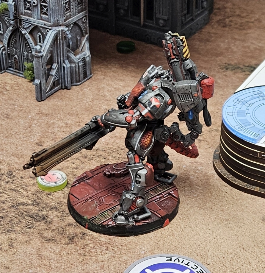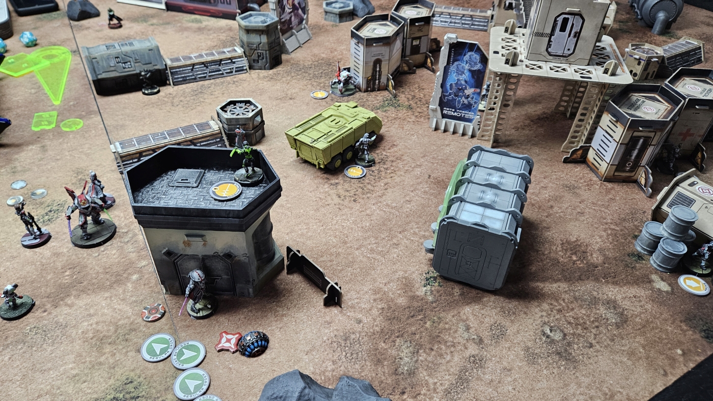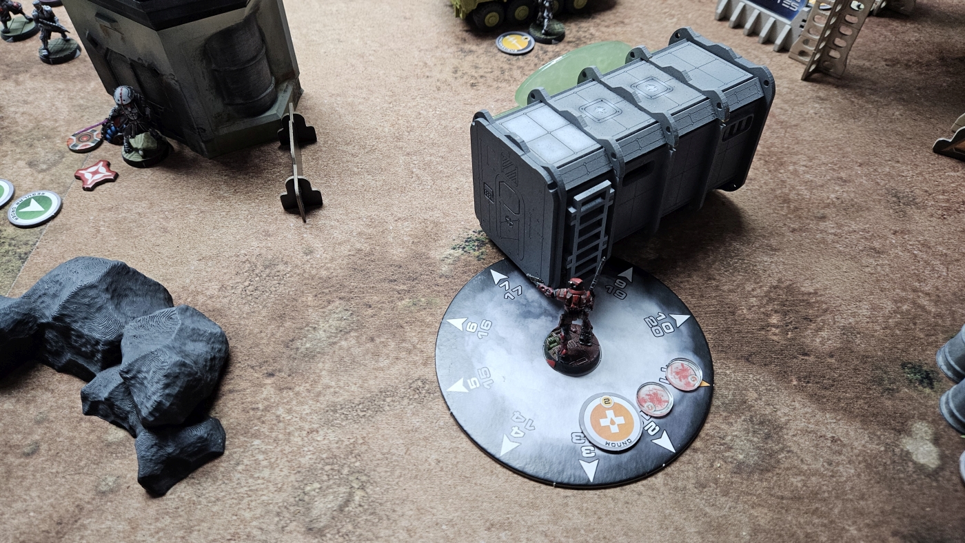 Die Nomads entschieden sich als Zweiter zu agieren. Nach meinem letzten Spiel, und erstem auf 300p, hatte sich das Core Fireteam mit Keisotsus, dem Kempei der als Keisotsu gilt, und dem Daiyokai als Spearhead bewährt. Zentral aufgestellt wollte ich dort etwas Schaden auf das Feld bringen und idealerweise auch in seinem Zug noch als gefährliches ARO dienen. Dieser Plan ging auch gut auf, da sein Iguana TAG anvisierbar war und mit einem sehr guten Würfelwurf gefolgt von schlechten Verteidigungswürfen direkt außer Gefecht gezogen wurde. Dieser statistische Ausreißer wurde etwas relativiert, da ich noch einige Order mit dem FT und Ryuken brauchte, um ihn komplett vom Feld zu nehmen. Ansonsten war für meinen ersten Zug nur noch der Shikami mit einem errungenen Supply Token erwähnenswert.