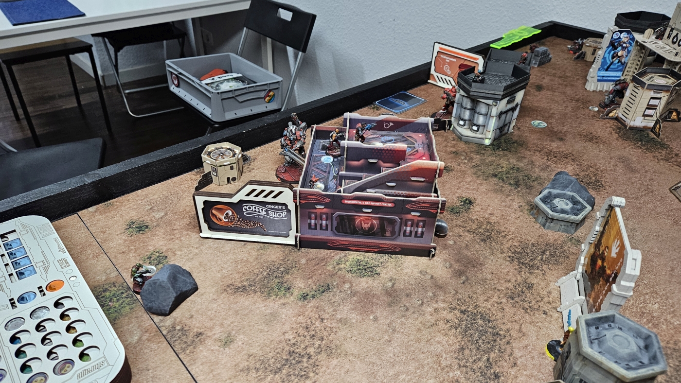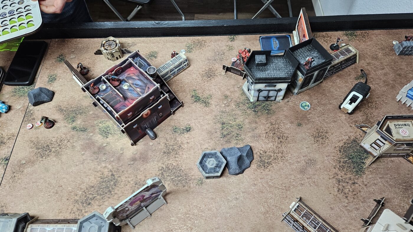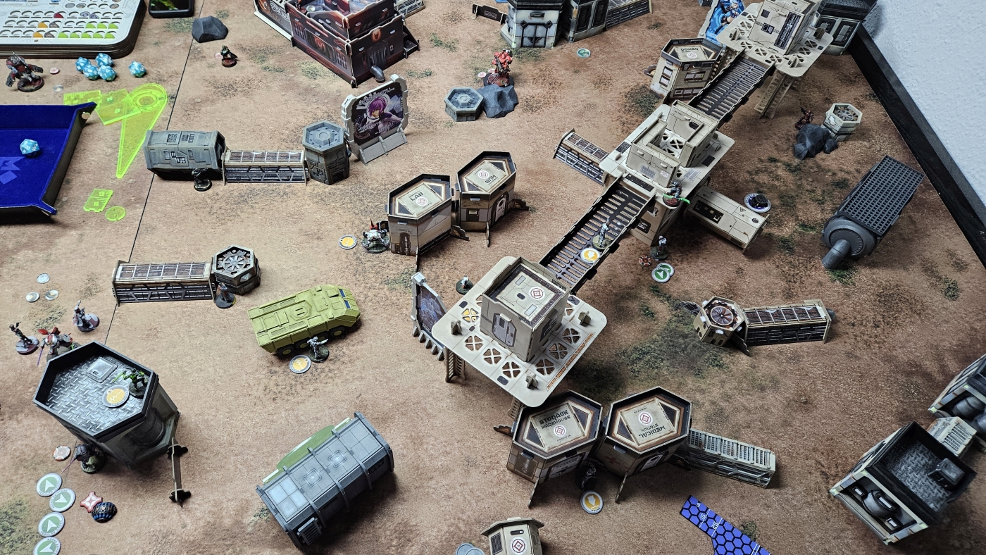 Dies reichte auch aus, damit er im letzten Zug meines Gegners nicht bezwungen werden konnte. Ich hatte meinen Yuan Yuan für Secure HVT zum stressen reingeholt, was aber noch vereitelt werden konnte. Mit dem Bezwingen meiner Paramedic und eigenem Secure HVT konnte der Sieg knapp für die Nomaden errungen werden. Ich hatte vorher eine meiner Secondary Objective Cards falsch verstanden, so dass ich darüber potentiell leicht hätte einen Punkt erzielen können. Ein erfolgreiches Spotlight hätte dafür gereicht.