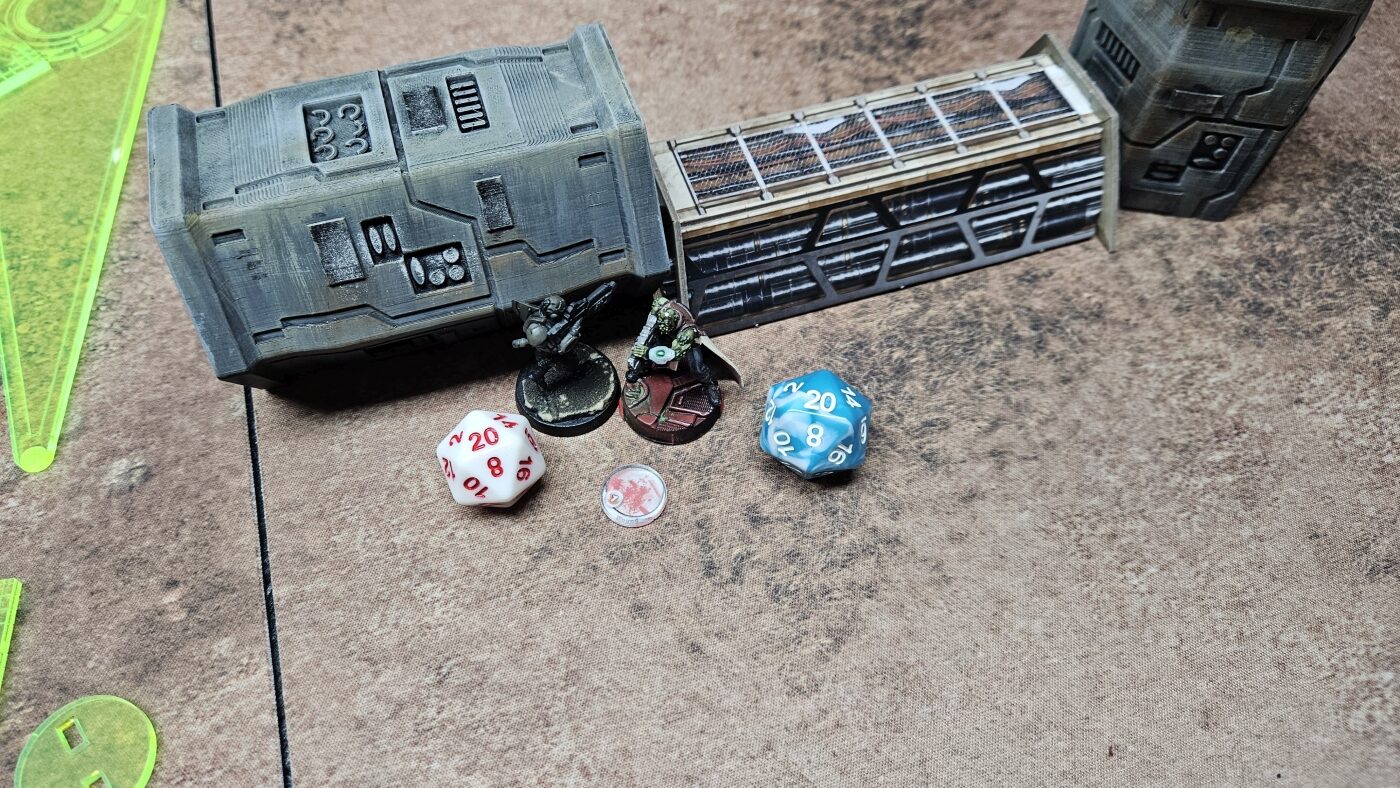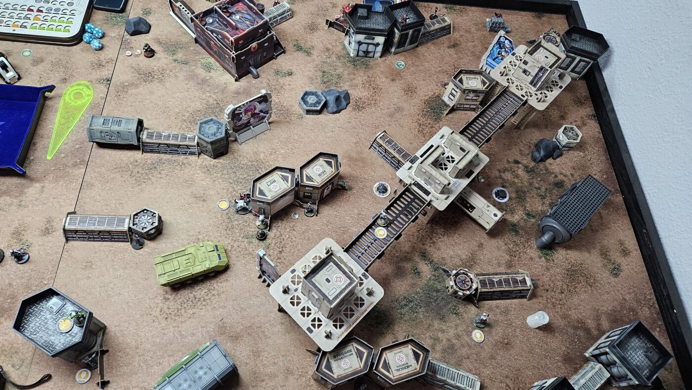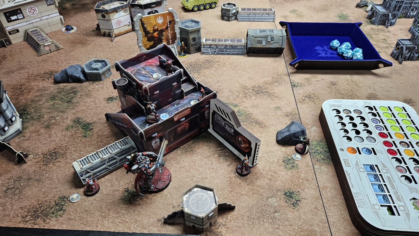Dies reichte auch aus, damit er im letzten Zug meines Gegners nicht bezwungen werden konnte. Ich hatte meinen Yuan Yuan für Secure HVT zum stressen reingeholt, was aber noch vereitelt werden konnte. Mit dem Bezwingen meiner Paramedic und eigenem Secure HVT konnte der Sieg knapp für die Nomaden errungen werden. Ich hatte vorher eine meiner Secondary Objective Cards falsch verstanden, so dass ich darüber potentiell leicht hätte einen Punkt erzielen können. Ein erfolgreiches Spotlight hätte dafür gereicht.