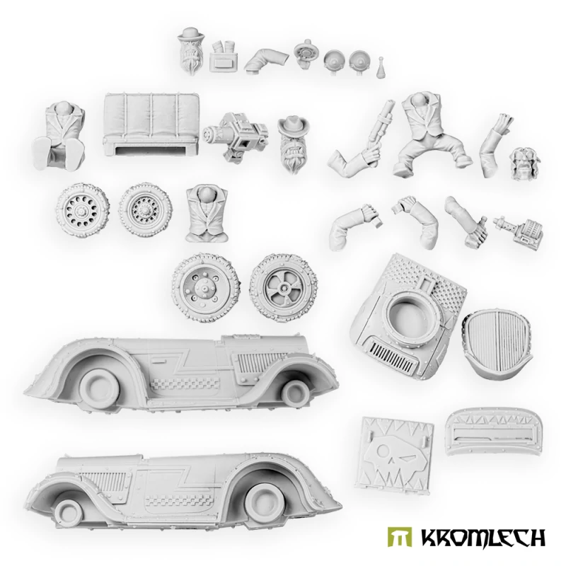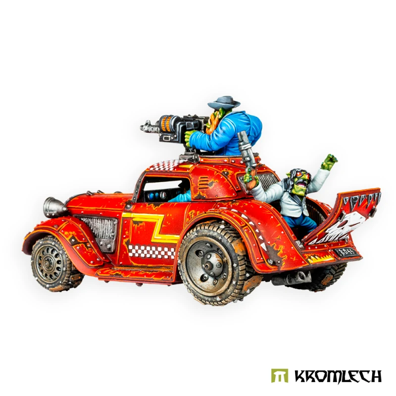This set contains one Eliminator ZZ Orc Wagon with a crew (two Orcs and one Goblin in thematic outfits), a removable rooftop, and an openable car trunk.