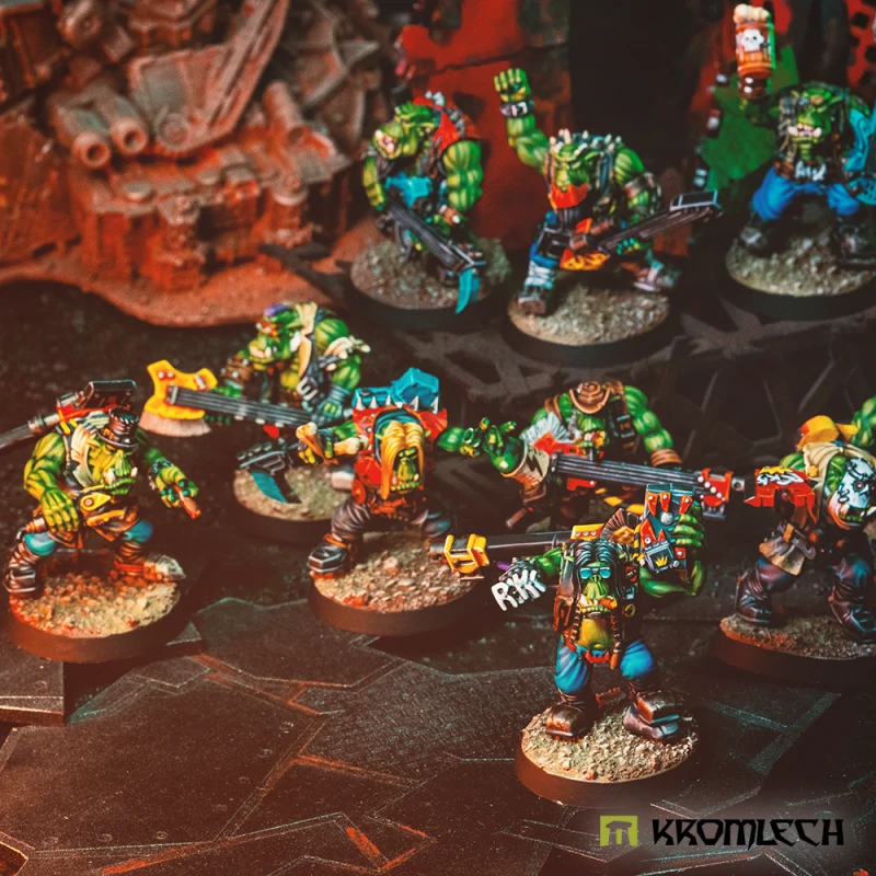 This set contains one Orc Rokkerboys Squad consisting of ten miniatures – Orcs armed with choppin‘-n‘-shootin‘ Guitars, as well as other musical weapons and accessories. Various designs of heads and bodies included. All parts in this set are interchangeable.