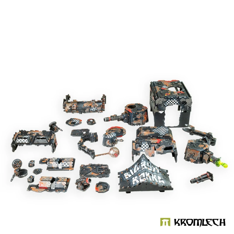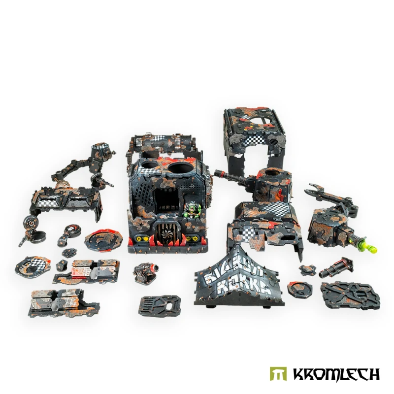 This set contains parts needed to assemble one Orc Tour Wagon made from high-density fibreboard. Includes resin parts: an Orc Rokker Driver, Smashin‘ Ball, wheels, hatches, guns, and cannons. The set is modular, allowing the building of numerous configurations of the Tour Wagon.