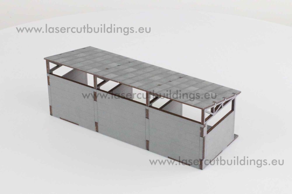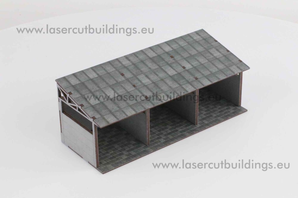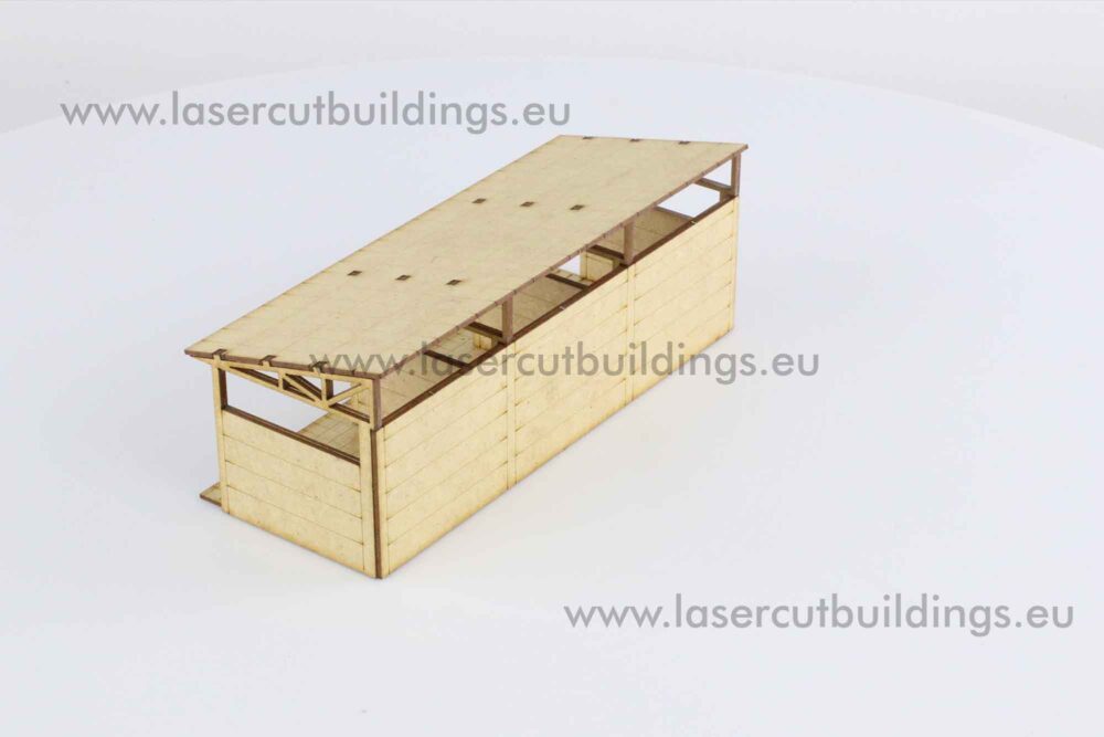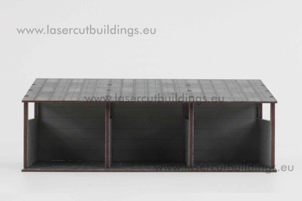 Bei Lasercut Buildings gibt es einen offenen Schuppen im 28mm Maßstab, als vorbemalte und unbehandelte Version.