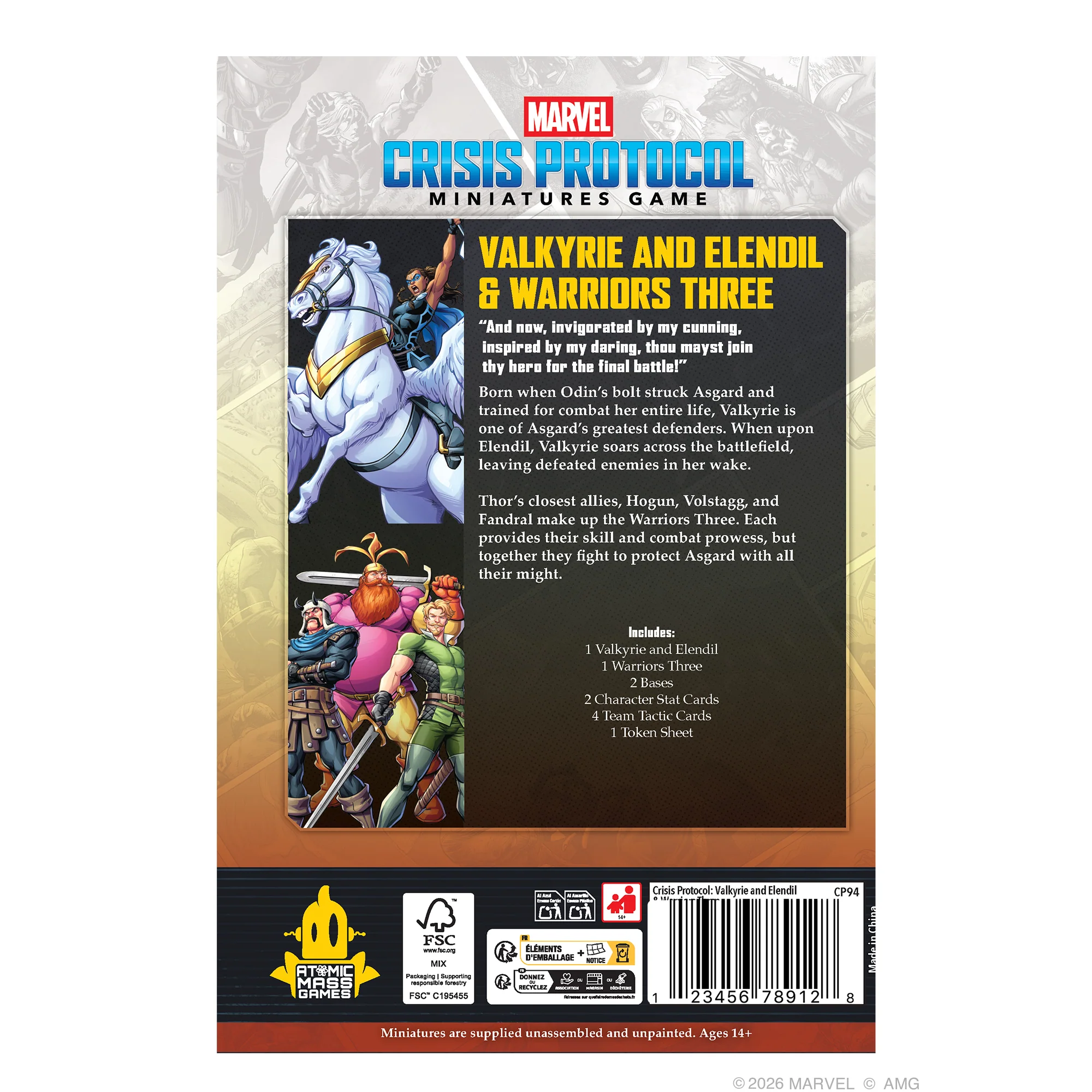 This character pack for Marvel: Crisis Protocol brings two new Asgardian characters to the game for the first time and is an ideal follow up for players looking to add some Asgardian reinforcements to CP91 Loki, Thor, Mighty Thor & Lady Sif or CP198 Asgardian Affiliation Packs. Valkyrie, or Valk, brings mounted speed and power and is an ideal pairing alongside the original Valkyrie from CP198. The Warriors Three bring a toolbox of abilities, representing the martial prowess and unique character of each individual hero to make up the group.