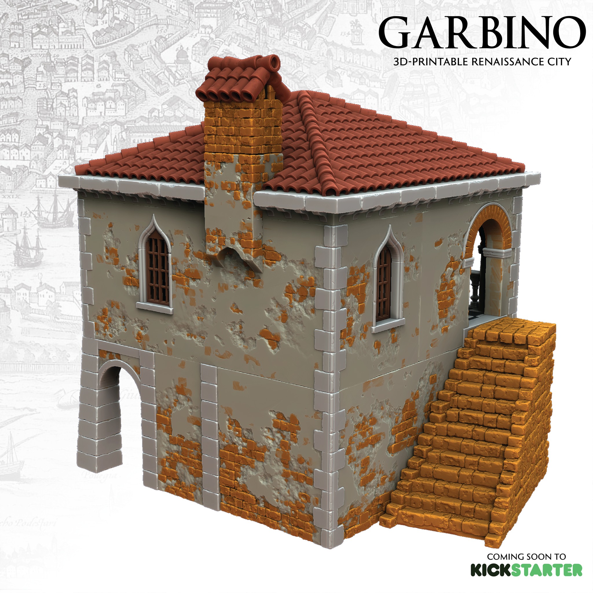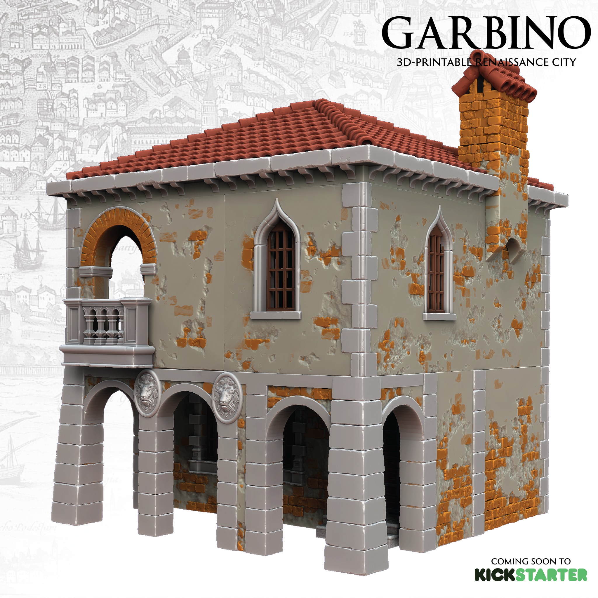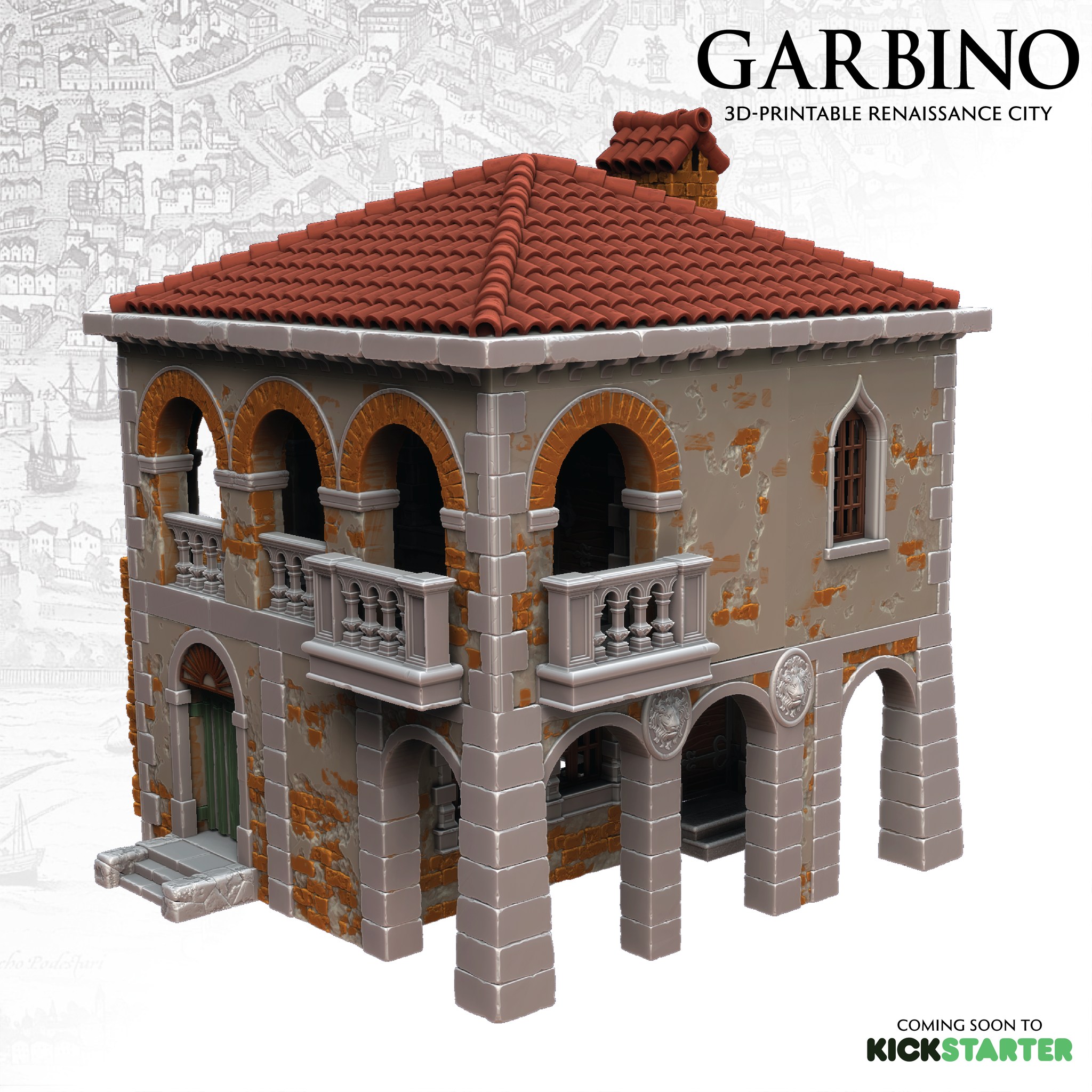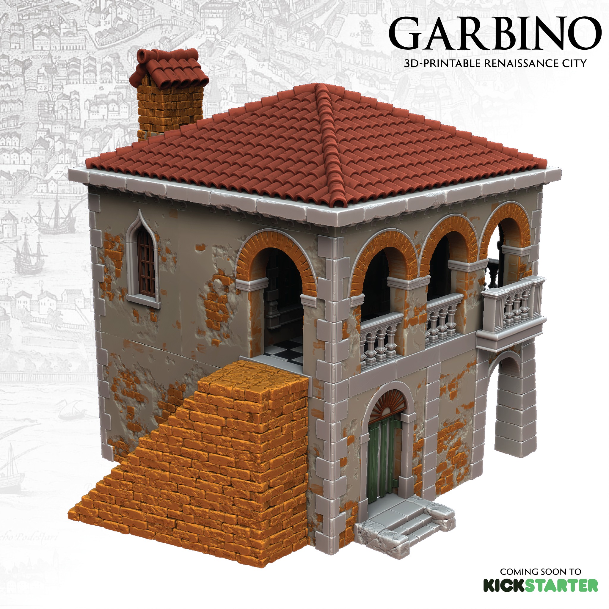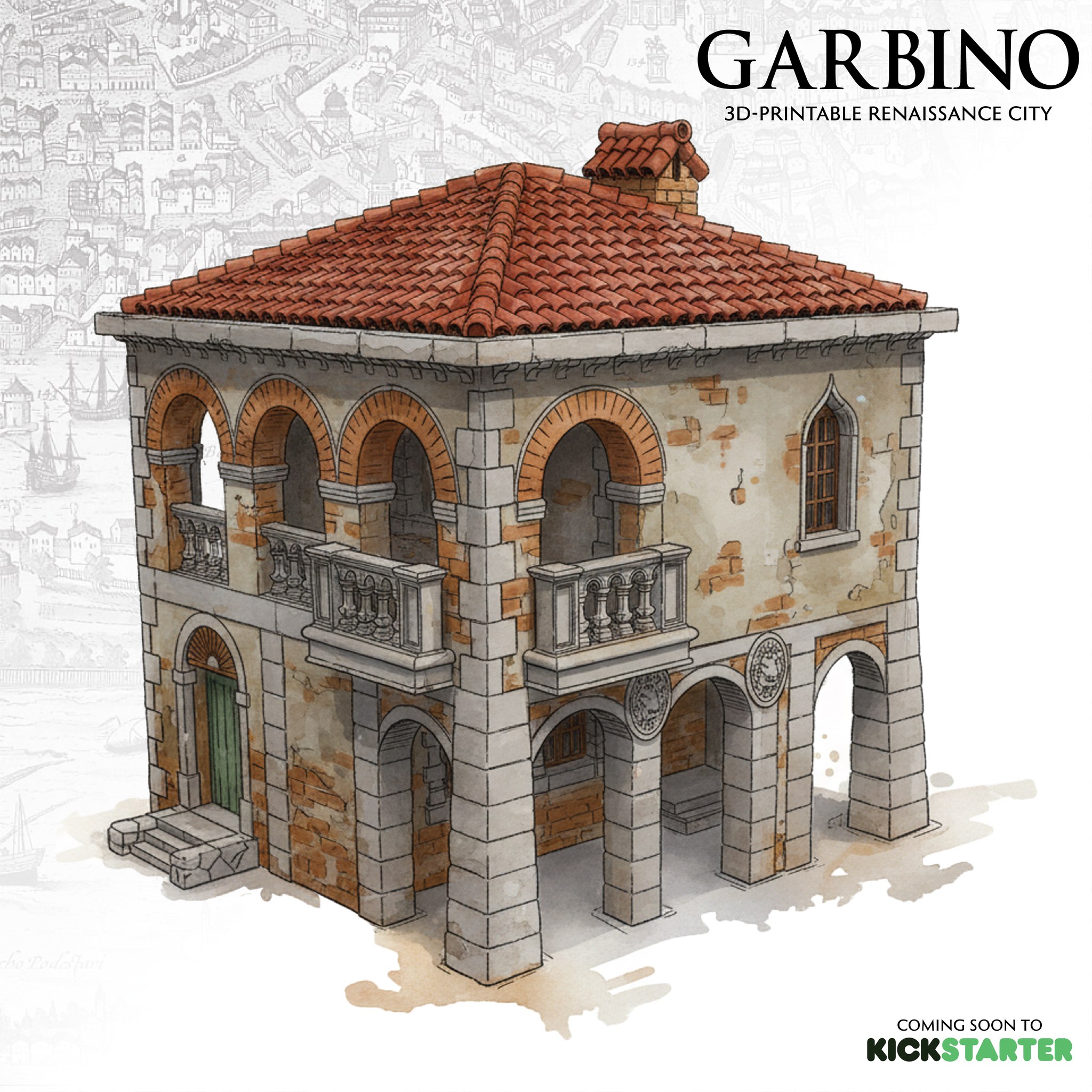PREVIEW(pre-launch page link in the comments)Included in the core pledge for Garbino, Casa Leoni is one of our favourite pieces from this upcoming. Featuring two accessible floors with removable modular interiors, three entry points with working doors, and multiple detachable pieces that could be swapped out with other parts from the range, it combines character, modularity, and playability in a way that we’re truly proud of. The square footprint allows you to rotate the upper floor, just switching the balconies around – and, of course, the entire building can be taken apart and combined with bits from other Garbino buildings to form entirely new structures.
