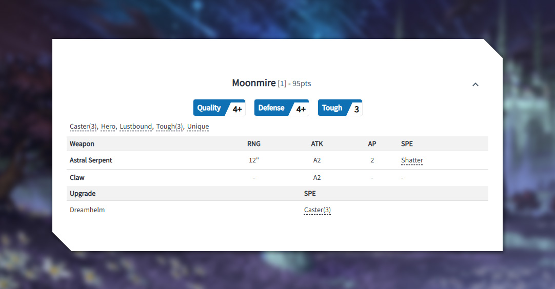 When on the table, Moonmire can use her Caster(3) spells to help shape and swing the battle, and pairs well with any short ranged units in the second line. Her two Astral Serpant attacks are especially great to target an opponent’s larger infantry and beasts with the Shatter rule helping to crack high defense units with ease.