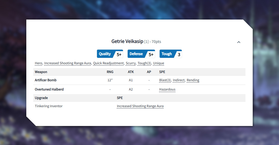 On the table, Getrie is a boon to any ranged focused squad! Her Increased Shooting Range Aura helps increase the threat of her unit, and with Quick Readjustment and Scurry, she can stay very responsive and mobile on the battlefield. Her bombs a great against soft infantry targets, even when they’re entrenched in cover, and for more heavily armored foes, her Overtuned Halberd is an effective, if dangerous, option!