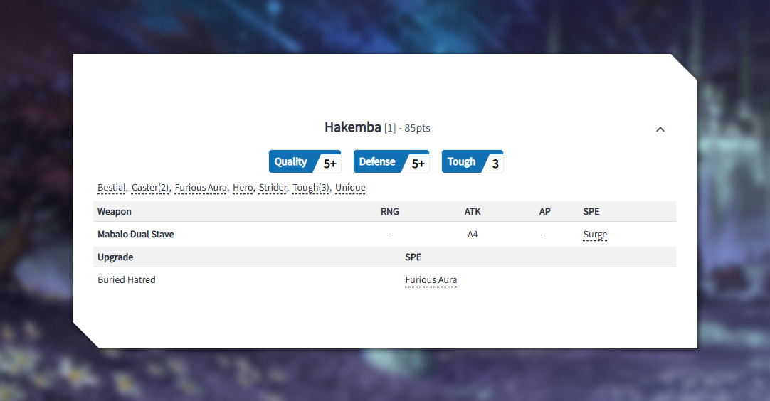 Hakemba is a intimidating frontline spellcaster with both Caster(2) and his Buried Hatred ability that gives him and his entire unit the Furious special rule. This can lead to an explosion of extra attacks, especially as Mabalo gets to double dip with his Mabalo Dual Stave also having Surge. When combined witht the Beastmen’s Strider ability, him and his unit can pull off some devistating surprise charges!