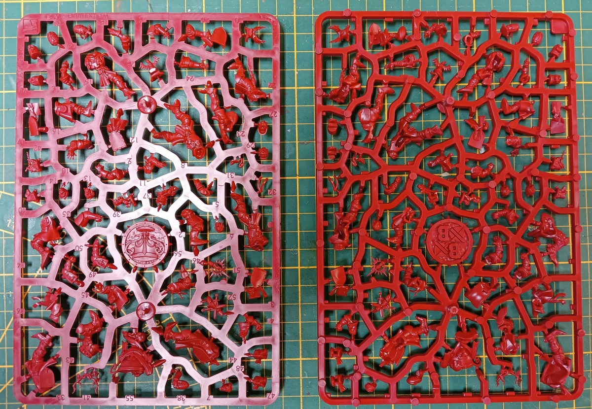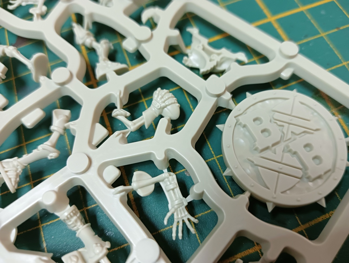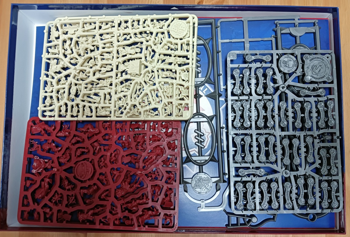Öffnet man Blood Bowl – Dritte Saison, wird man zunächst von den Plastikgussrahmen begrüßt. Jeweils zwei für die beiden Teams, Khemri und Bretonen, und zwei für weiteres Spielmaterial. Darunter, getrennt durch eine dünne Pappe, folgen die Bases und alles weitere Spielmaterial.