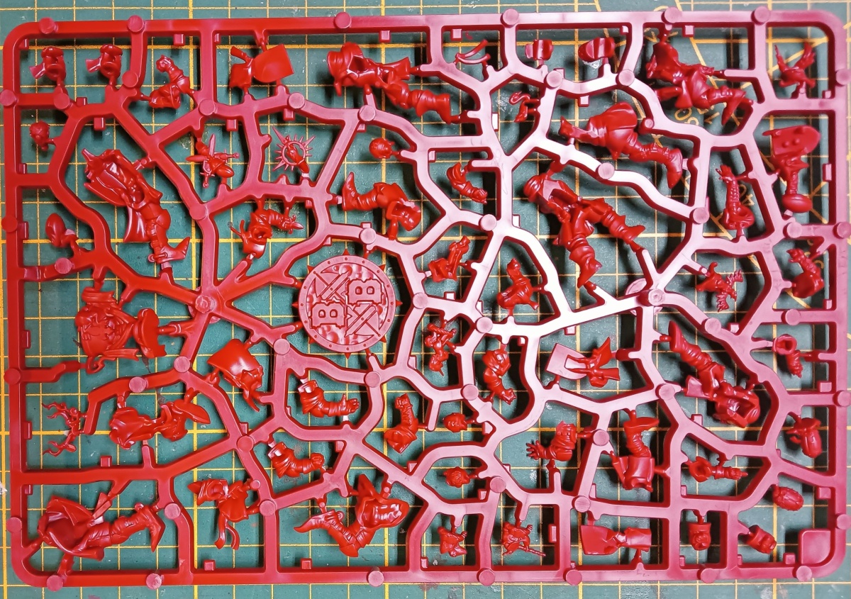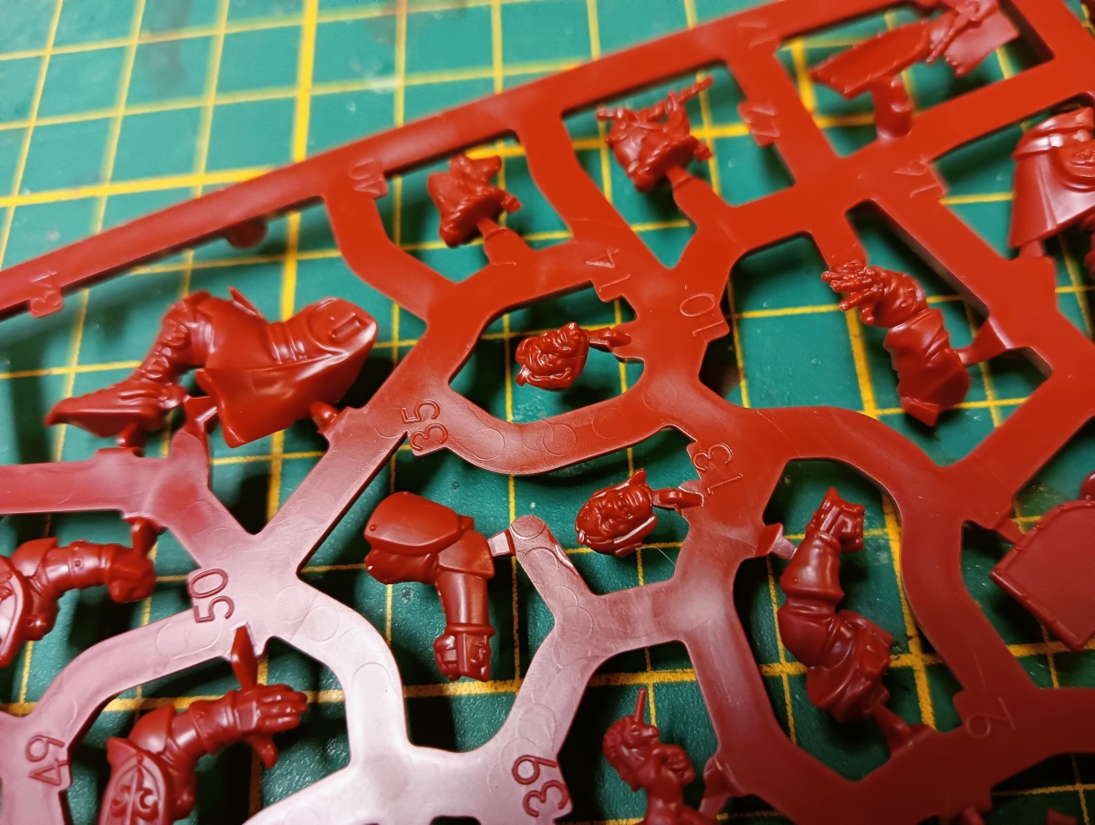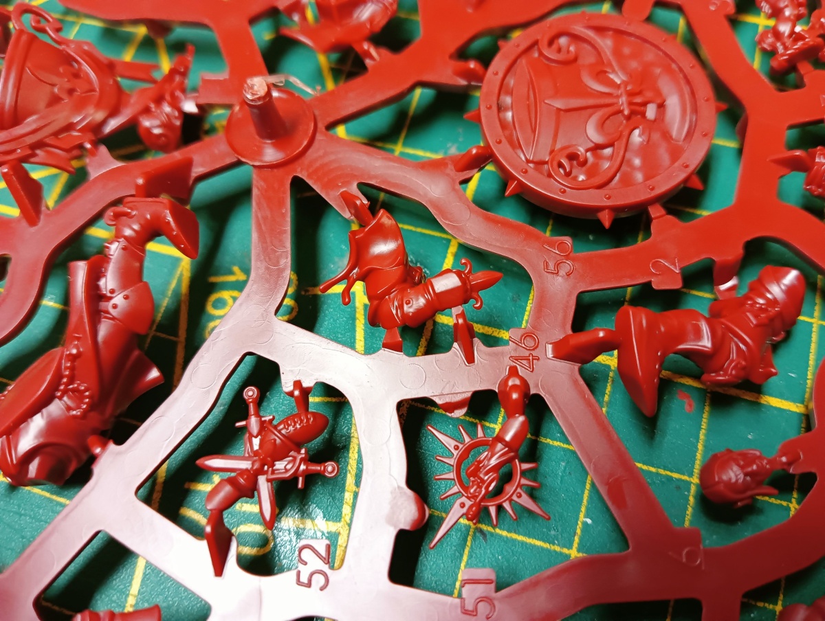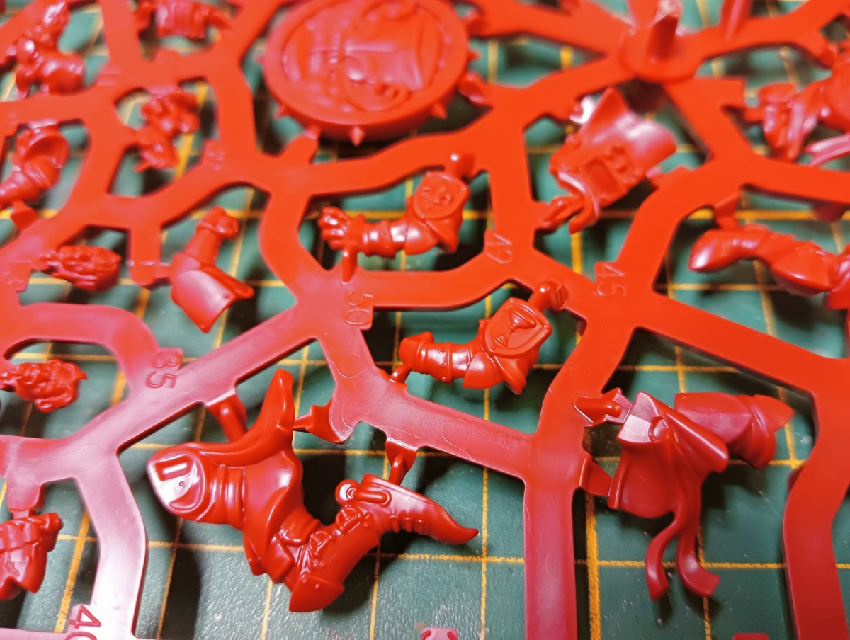 Werfen wir zunächst einen Blick auf das Bretonen-Team, das auf rotem Gussrahmen daher kommt. Wie bei Blood Bowl Teams üblich, sind die beiden Gussrahmen identisch und damit erhält man alles doppelt. In einem Gussrahmen sind drei Bretonen-Knappen, ein Bretonen-Ritter-Fänger, ein Bretonen-Ritter-Werfer und ein Gralsritter. Die Knappen und der Werfer besitzen jeweils einen alternativen Kopf, der Fänger hat drei verschiedene Helmverzierungen. Beim Gralsritter kann zwischen zwei Visieren und zwei Helmverzierungen gewählt werden sowie zwischen linken Armen. Ebenfalls Armvariationen hat der Werfer und einer der Knappen, die jeweils einen Alternativarm haben. Neben den Miniaturen sind auch eine Münze, ein Wiederholungswurfmarker und zwei Bälle in dem Gussrahmen enthalten.