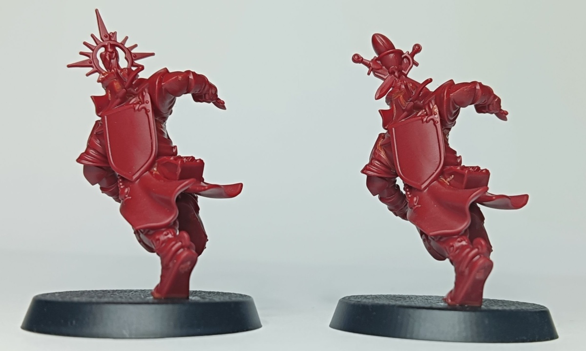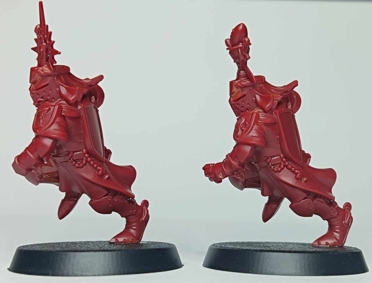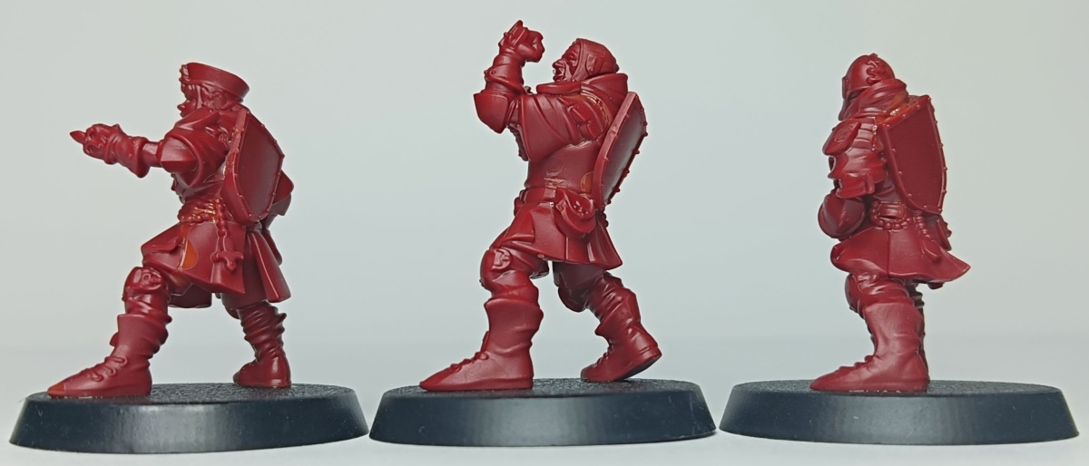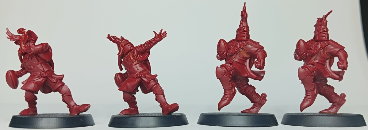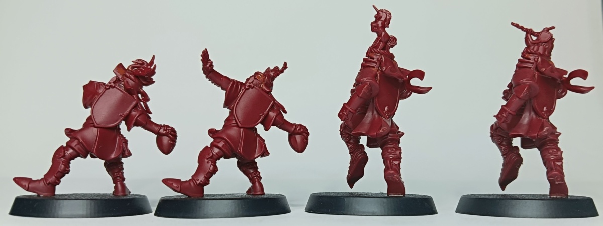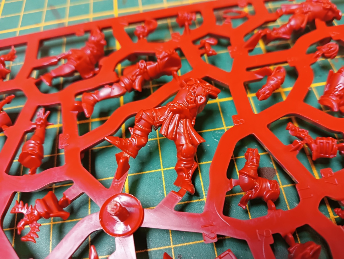 Werfen wir zunächst einen Blick auf das Bretonen-Team, das auf rotem Gussrahmen daher kommt. Wie bei Blood Bowl Teams üblich, sind die beiden Gussrahmen identisch und damit erhält man alles doppelt. In einem Gussrahmen sind drei Bretonen-Knappen, ein Bretonen-Ritter-Fänger, ein Bretonen-Ritter-Werfer und ein Gralsritter. Die Knappen und der Werfer besitzen jeweils einen alternativen Kopf, der Fänger hat drei verschiedene Helmverzierungen. Beim Gralsritter kann zwischen zwei Visieren und zwei Helmverzierungen gewählt werden sowie zwischen linken Armen. Ebenfalls Armvariationen hat der Werfer und einer der Knappen, die jeweils einen Alternativarm haben. Neben den Miniaturen sind auch eine Münze, ein Wiederholungswurfmarker und zwei Bälle in dem Gussrahmen enthalten.