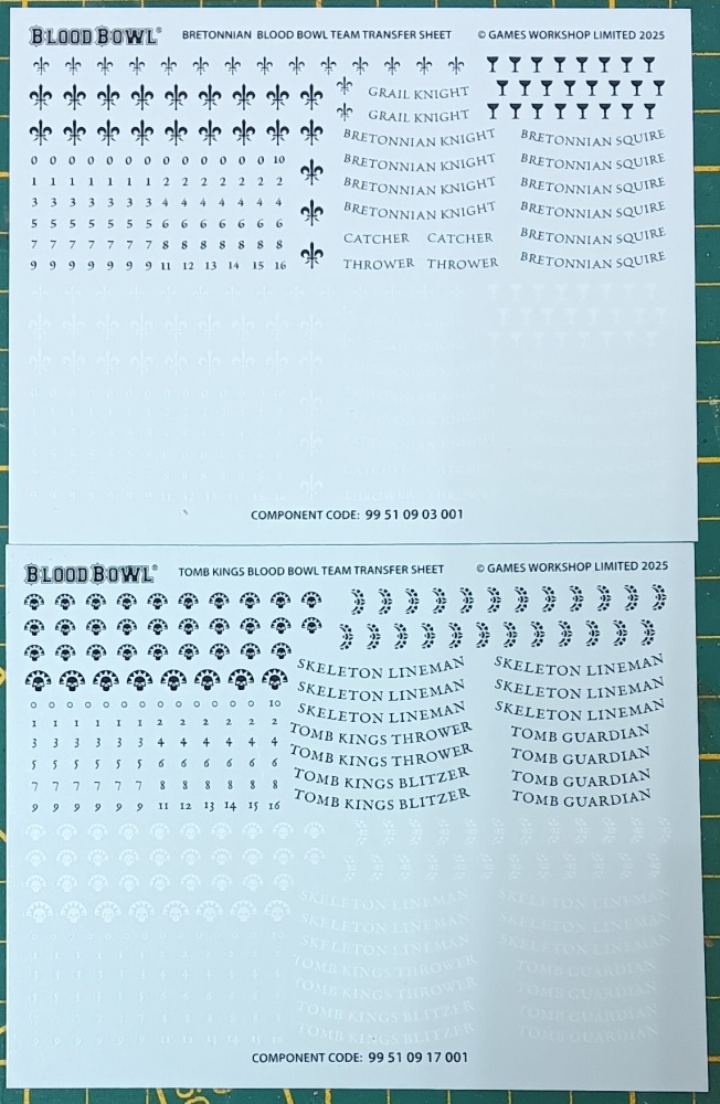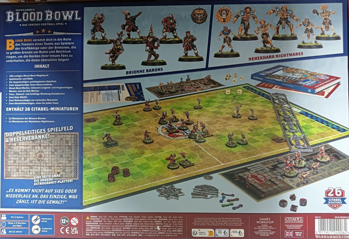 Neben den Gussrahmen befinden sich in der Box zwei Abziehbilderbogen, einer für das Bretonen-Team und einer für das Gruftkönige-Team, 26 32mm Bases für die beiden Teams, zwei Blood Bowl Würfelsets, eines in Knochenoptik und eines in Schwarz-Rot, eine Bauanleitung, das neue Regelbuch als Hardcover, zwei Referenzkarten, eine mit den Werten für die Bretonen und eine mit den Werten der Gruftkönige und zuletzt zwei Team-Reservebänke und ein Spielfeld aus Pappe. Die Reservebänke und das Spielfeld sind doppelseitig bedruckt, eine Seite ist Rasenoptik und die andere Astrogranit.