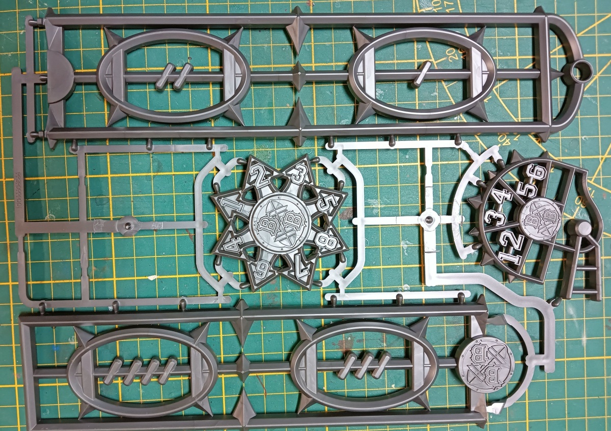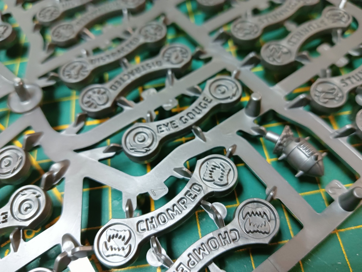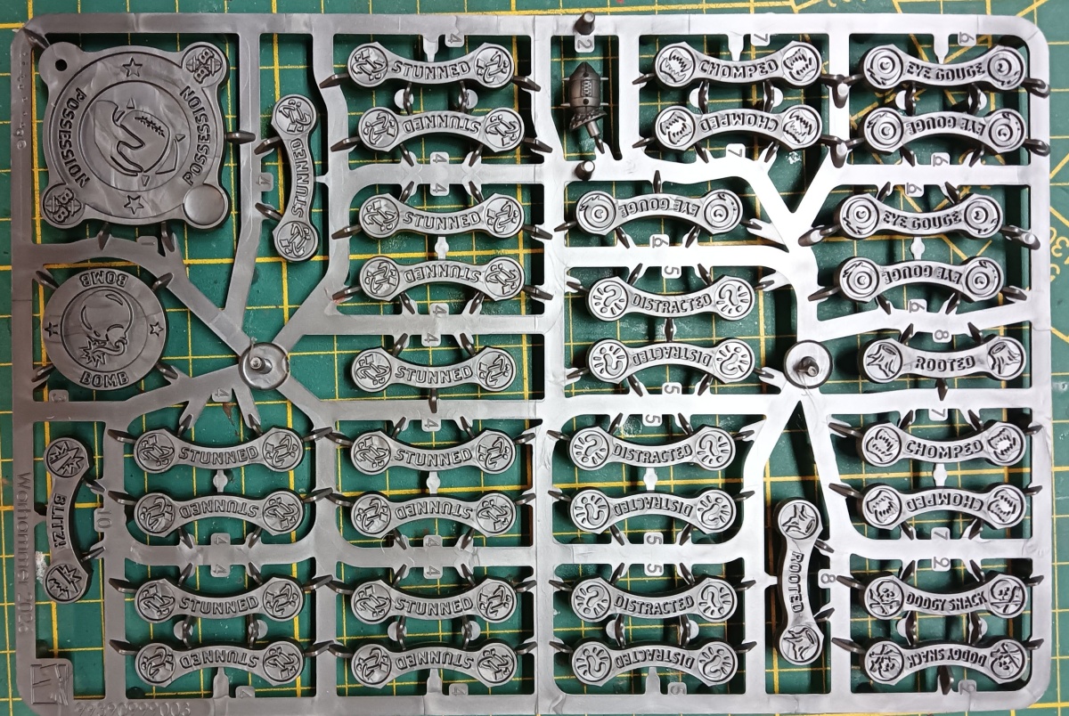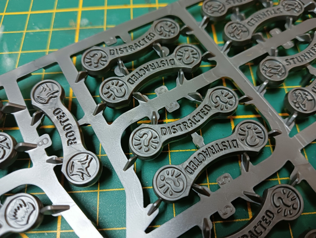 Ansonsten ist anzumerken, dass es empfehlenswert ist, die meisten Status-Marker im Gussrahmen zu grundieren und zu bemalen. Denn darin sind sie deutlich leichter zu handhaben.