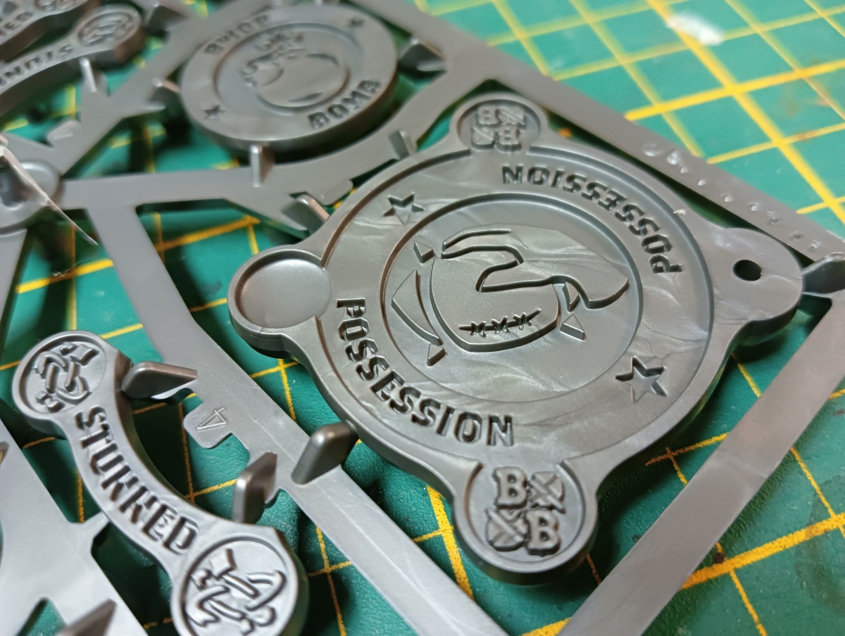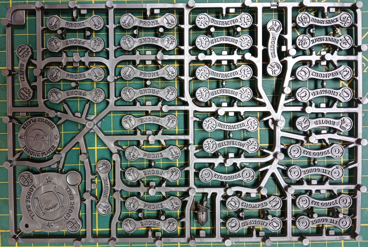Einen weiteren neuen Gussrahmen gibt es noch, und zwar mit Spielmarkern. Dieser ist einmal in der Box enthalten und bietet einiges an Statusmarkern. Ein Gussrahmen enthält einen Blitz-Marker, zwei Verwurzelt-Marker, zwei Schlechter-Snack-Marker, vier Gebissen-Marker, fünf Auf-Die-Augen-Marker und sechs Abgelenkt-Marker, welche auf beiden Seiten das gleiche zeigen. Vierzehn Marker sind enthalten, die auf einer Seite Liegend anzeigen und auf der anderen Seite Angeschlagen. Es gibt einen Marker für geworfene Spieler mit dem man den geplanten Landeplatz anzeigen kann. Die Rückseite von diesem Marker ist ein Bomben-Marker für das Werfen einer Bombe. Zuletzt gibt es noch einen Ball und einen Marker mit dem man entweder Ballbesitz oder einen freien Ball markieren kann. Dieser Marker hat eine Schale, in der ein Ball platziert werden kann und einen Platz, in dem ein Ball mit Steg hineingesteckt werden kann. Zusätzlich ist die Seite für den Ballbesitz so designt, dass eine Miniatur auf einer 32mm Base darin platziert werden kann.