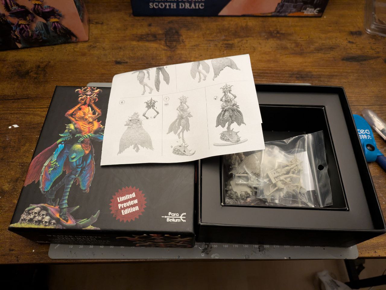 So sieht der erste Blick in die Box aus. Die Box gefällt mir deutlich besser als die kleinen Pappschuber, in denen Charaktermodelle von Para Bellum sonst zu finden sind. Entsprechend viel Spaß macht es auch, die Box das erste Mal zu öffnen.