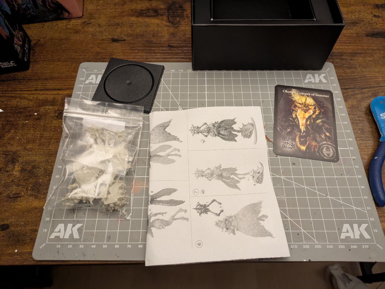 Enthalten sind eine Brute Base samt Stand, diverse Beutelchen mit Resin-Teilen, eine Bauanleitung sowie eine Aktivierungskarte.