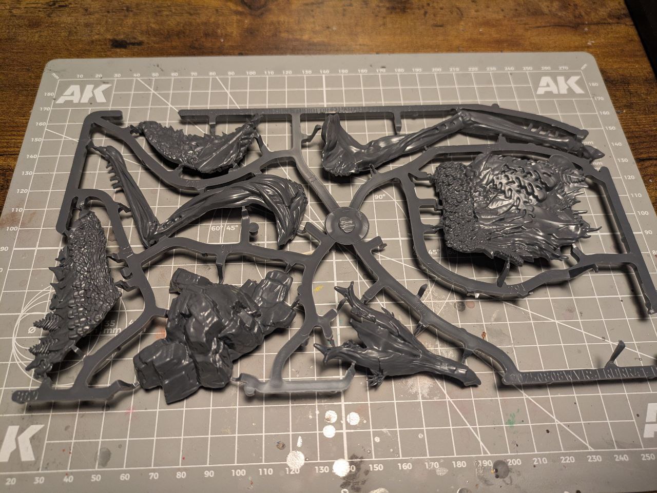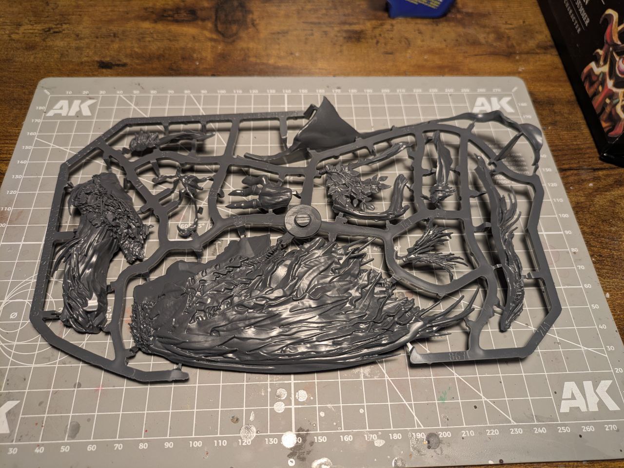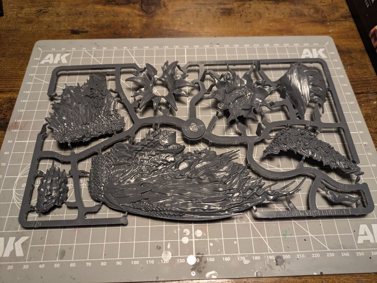 Und das ist drin: Fünf(!) Gussrahmen, eine Bauanleitung, zwei Aktivierungskarten und natürlich eine Monster-Base samt Stand. Da ich die schiere Menge an Plastik sehr beeindruckend fand, gibt es hier nochmal eine Seiten-Ansicht.