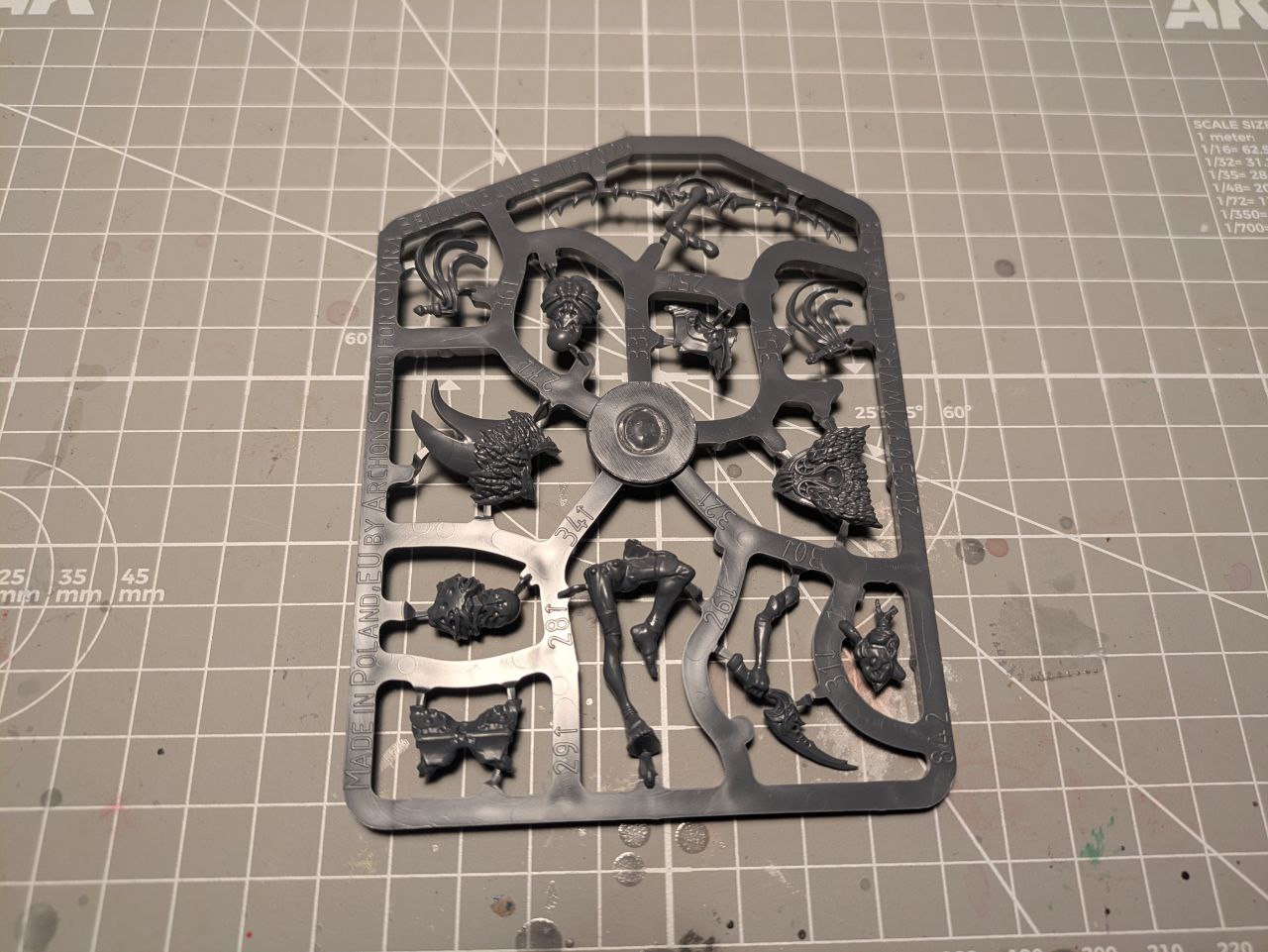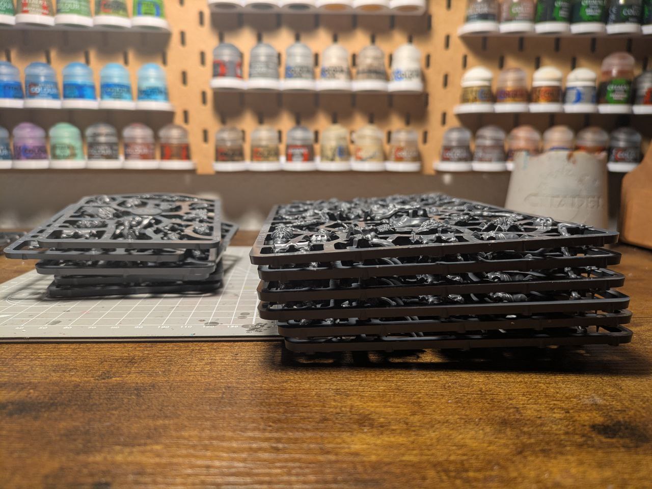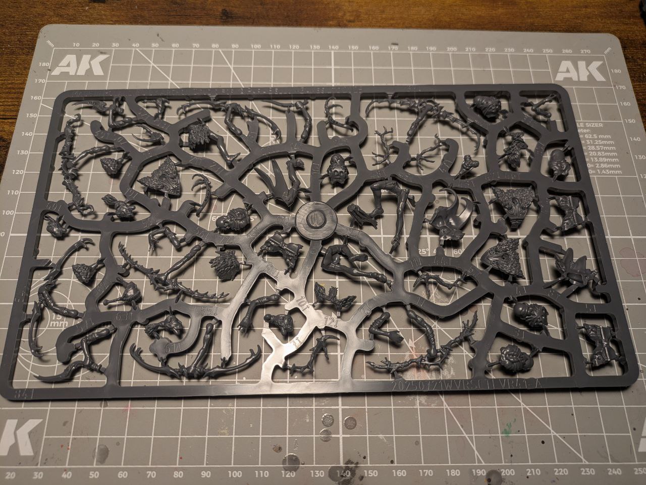 Und da es mich wirklich nachhaltig beeindruckt hat, wie viel Plastik man in der Starter-Box für zwei Einheiten Kern Skirmisher bekommt, habe ich hier nochmal den Berg an Gussrahmen fotografiert, den ich auf dem Tisch hatte.