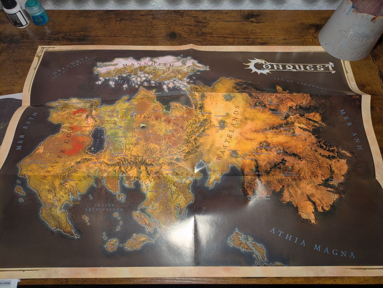 Besonders gefällt mir, dass Para Bellum sich die Mühe machen, mit 2D-Gelände, einer Messhilfe und Gelände sowie einer Karte und diversen Guides auch absolute Anfänger abzuholen. Das ist definitiv nicht selbstverständlich, und selbst ich als Veterane freue mich über Dreingaben wie das 2D-Gelände und die gedruckte Karte der Conquest-Welt Eä – obwohl ich die natürlich schon aus anderen Starter-Sets habe.